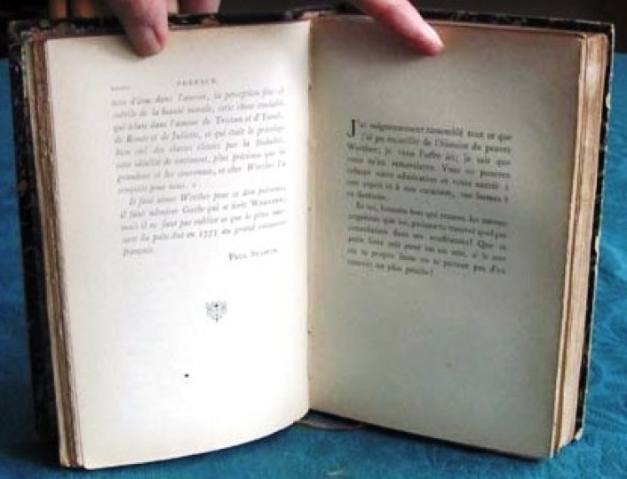 "Les Souffrances du jeune Werther" (en allemand "Die Leiden des jungen Werthers") est un roman épistolaire écrit par l'écrivain allemand Johann Wolfgang von Goethe. Il a été publié pour la première fois en 1774 et est l'une des œuvres les plus célèbres et influentes de la littérature allemande et européenne du XVIIIe siècle. L'histoire du roman est racontée à travers les lettres que le personnage principal, un jeune homme nommé Werther, écrit à son ami Wilhelm. Werther, un artiste sensible et romantique, arrive dans une petite ville allemande et tombe amoureux d'une femme, Charlotte, qui est déjà fiancée à un autre homme. Cette histoire d'amour impossible conduit Werther à des souffrances intenses et à une passion dévorante. Le roman explore les thèmes du romantisme, de l'amour, de la mélancolie et de la révolte contre la société. "Les Souffrances du jeune Werther" a eu un impact significatif sur la culture européenne de l'époque et a été l'un des premiers exemples du mouvement littéraire du romantisme. Le personnage de Werther est devenu un archétype du jeune homme romantique, tourmenté par ses émotions et sa quête de l'idéal. Le roman a également suscité un engouement important en Europe, donnant lieu à ce que l'on a appelé "le mal de Werther", une tendance à l'imitation du comportement suicidaire du personnage principal par certains jeunes lecteurs. Goethe lui-même a écrit le roman à l'âge de 24 ans, alors qu'il était en plein mouvement romantique. Cependant, plus tard dans sa vie, Goethe a évolué vers d'autres styles littéraires, comme le classicisme, et il est devenu l'un des écrivains les plus importants et polyvalents de l'histoire littéraire européenne. "Les Souffrances du jeune Werther" reste une œuvre emblématique de la littérature mondiale et continue d'être étudiée et lue pour sa contribution à la compréhension du mouvement romantique et de l'âme humaine. introduction d'Edmond Pilon, illustrations en couleurs de Calbet exemplaire numéroté 2532 sur vélin volume in-8, 190x130, relié demi cuir à coins, superbe état intérieur, 206pp, tranche de tête dorée, couvertures d'origines conservées avec dos, très bel exemplaire ! Paris Edition d'Art Piazza, 1935 ref/126