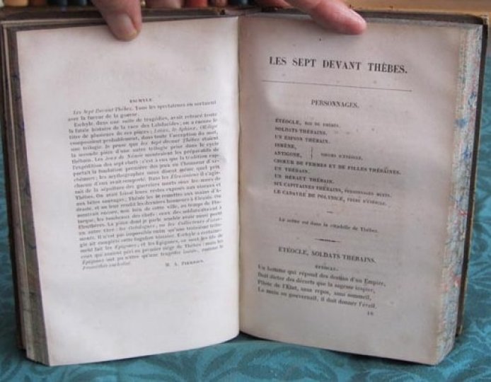 Nouvelle traduction en vers par Francis Robin.Table : A M. Tissot - Lettre de M. Tissot à l'auteur - Avant-propos - Prométhée enchainé - Les Suppliantes - Les Sept devant Thèbes - Les Perses - L'Orestie - Argument de l'Orestie - Agamemnon - Les Choéphores - Les Euménides.Paris, Hachette ; Delalain - 1846 - 404 pages. Reliure basane fauve racinée de l'époque. Dos lisse avec étiquette de titre noire. Tranches marbrées. Rousseurs. Assez bon état. Format in-12°(18x12).