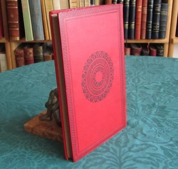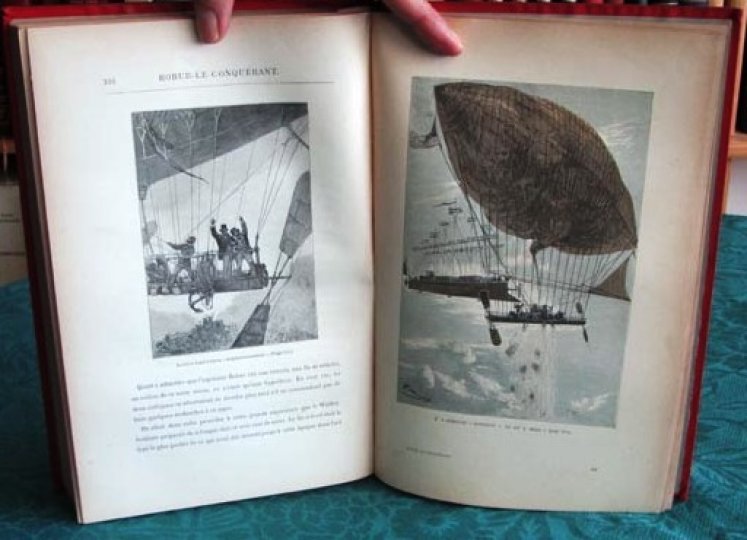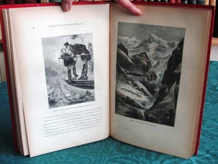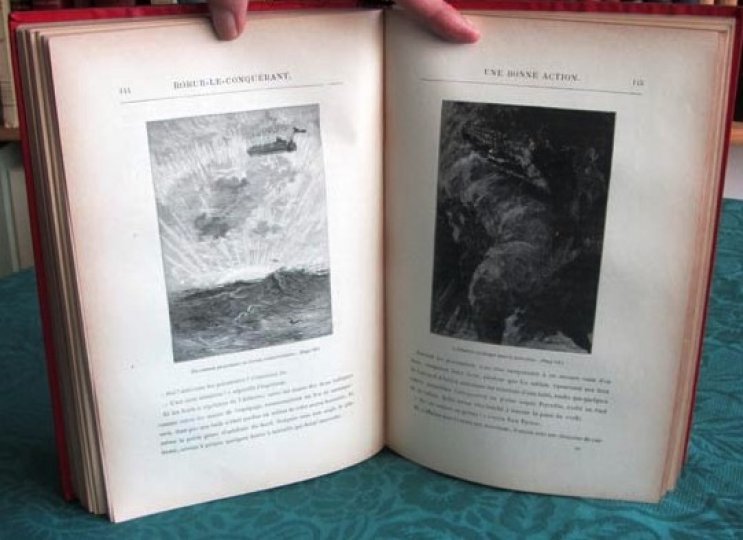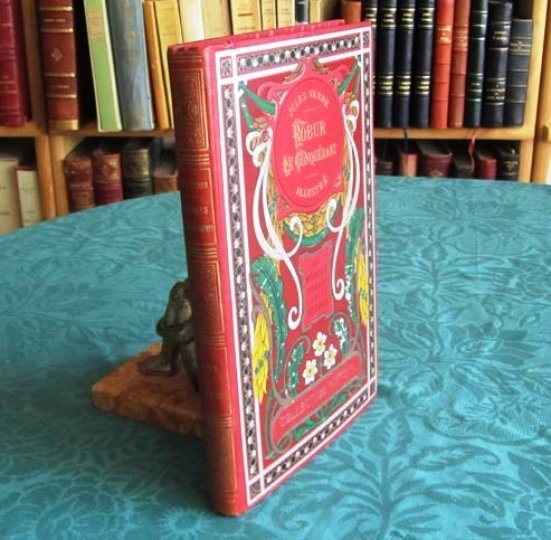 Les Voyages Extraordinaires. Les Mondes connus et inconnus. 45 dessins par Benett. 3 planches hors texte en couleurs.Paris, Collection Hetzel - 1906 - 218 pages. Imprimé par Belin Frères, relié par Magnier.Cartonnage Hetzel aux Feuilles d'acanthe, macaron rouge. Tranches dorées. Gouttière régulière. Petit accroc en bordure de tête du premier plat. Perte de couleur dans les feuilles d'acanthe. Pas de rousseur. Bon état. Format in-4°(27x18).