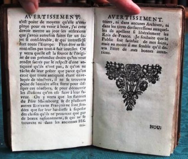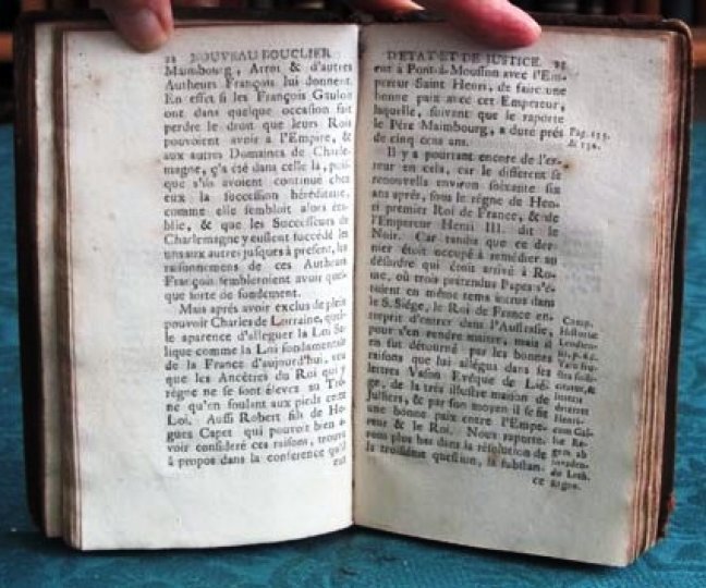 Ou l'on découvre le peu de fondement qu'ont les Rois de France dans leurs prétentions à l'Empire et aux autres Royaumes de Charlemagne et où l'on combat les Paradoxes avancez par le Père Maimbourg dans son Histoire de la Décadence de l'Empire après Charlemagne. Epistre de H.P.G. Preudhomme.Ouvrage rare. A Amsterdam, chez Pierre Chayer - 1696 - Epistre, Avertissement et 130 pages. Tampon ex-libris Wattez F. et M.P.J. Lacquemant.Reliure plein veau moucheté de l'époque. Dos à nerfs orné et doré. Tranches jaspées rouge. Glose. Coins émoussés. Accidents aux coiffes. Petite déchirure au bord de la page de garde. Pas de rousseur. Bon état intérieur. Format in-12°(16x10).