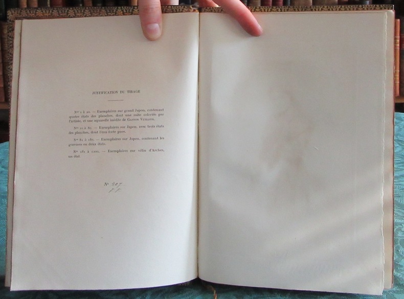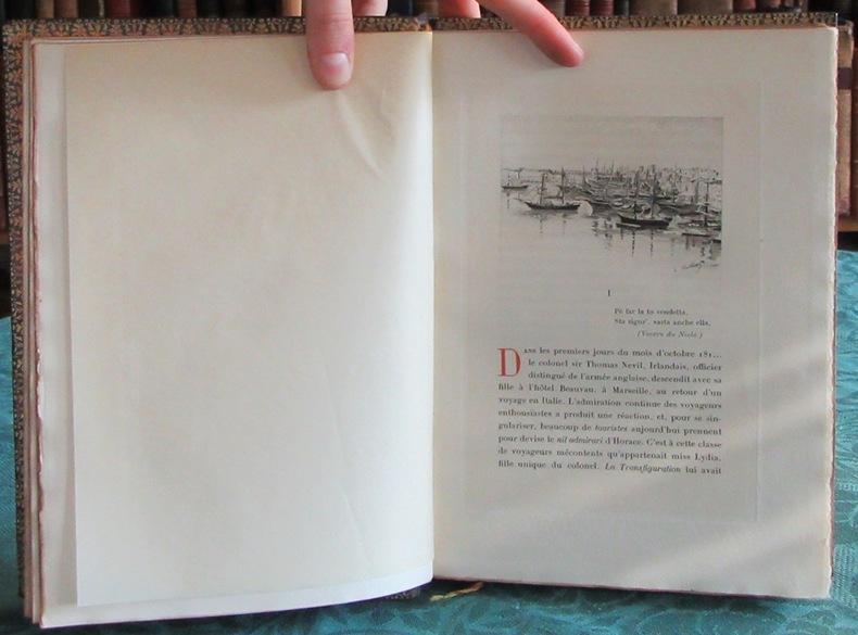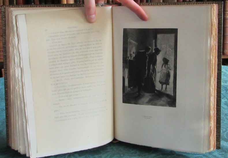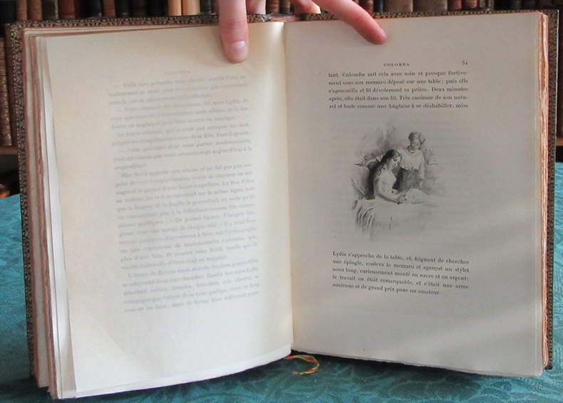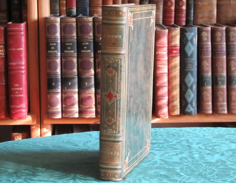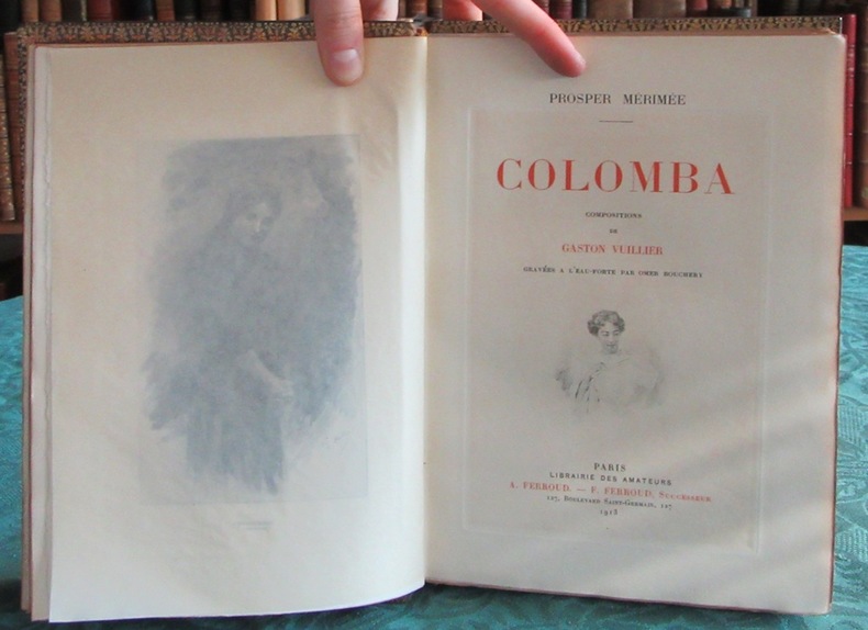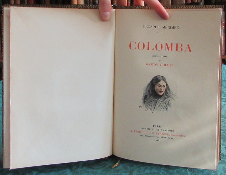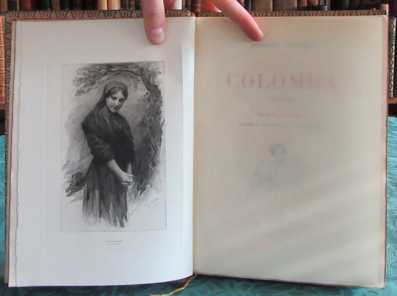 Par Prosper Mérimée. Compositions de Gaston Vuillier, gravées à l'eau-forte par Omer Bouchery.Edition tirée à 1200 exemplaires. Celui-ci N° 407, un des exemplaires sur vélin d'arches.Paris, Librairie des amateurs, A. Ferroud, F. Ferroud, successeur - 1913 - 222 pages.Splendide reliure plein cuir marbré, de l'époque, signée E. Colle au dos. Dos à nerfs orné en long filets et fers dorés. Petites mosaïques de maroquin. Large bordure intérieure. Encadrement de filets dorés avec fer d'angle mosaïqués et dorés sur les plats. Tête dorée. Couverture illustrée et dos, conservés. Pas de rousseur. Parfait état. Format in-8°(24x18).