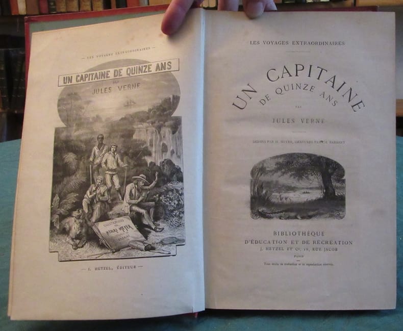 Les Voyages extraordinaires. Dessins par H. Meyer, gravures par Ch. Barbant.Paris, Bibliothèque d'Education et de Récréation J. Hetzel et Cie. Sans date (1891) - 376 pp. Catalogue (FX) 1891-1892. Imprimé par Gauthier-Villars, relié par Lenègre. Rosace du plat inférieur indiquant JH et Collection Hetzel. Le cartonnage au portrait collé est édité de 1891 à 1895.Cartonnage Hetzel au portrait collé. Dos au phare. Tranches dorées. Gouttière régulière. Un nom sur la page de garde. Gardes bleues. Pas de rousseur. Très bon état. Format in-4°(28x19).