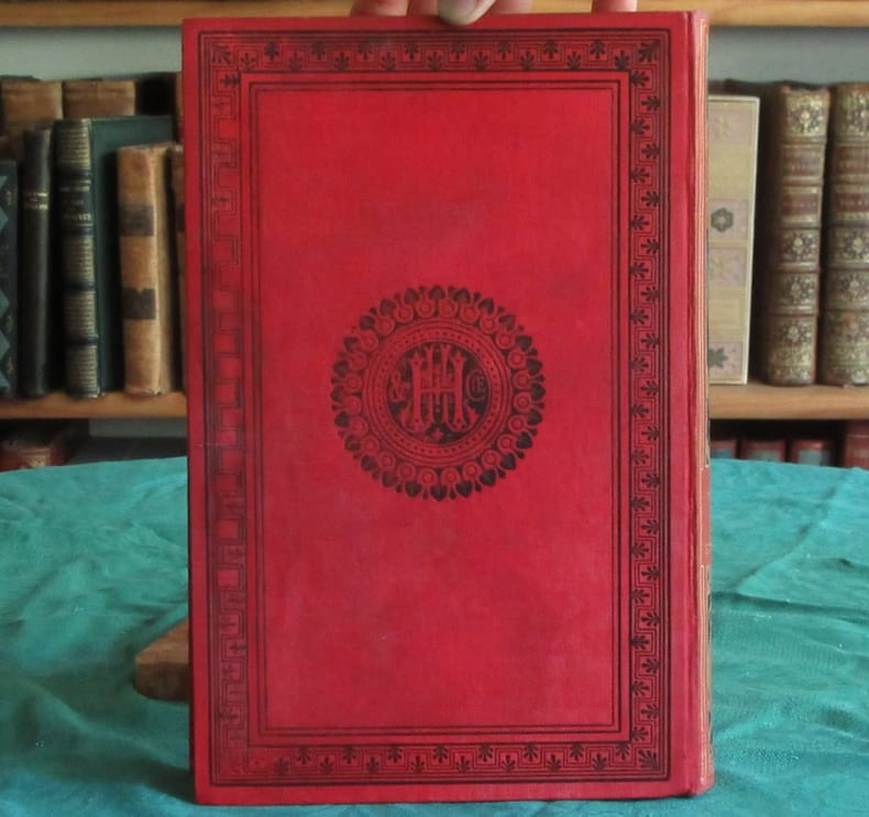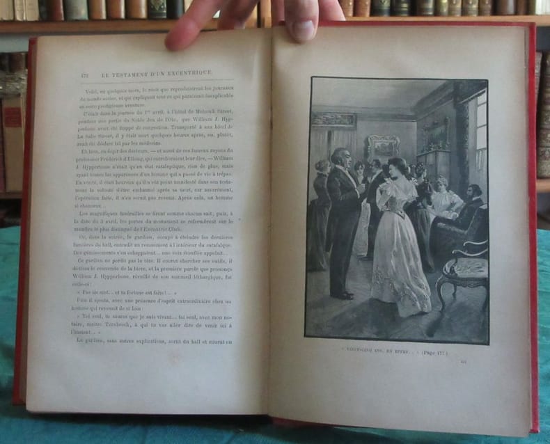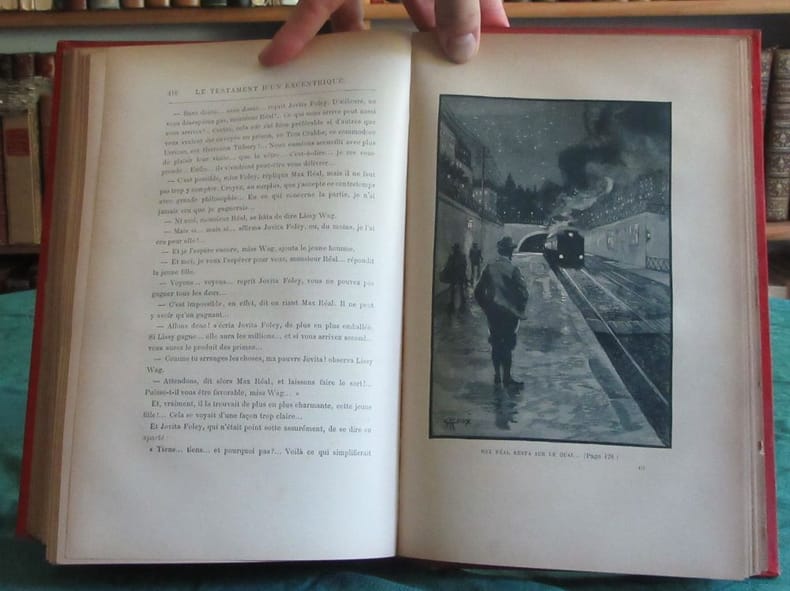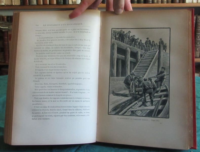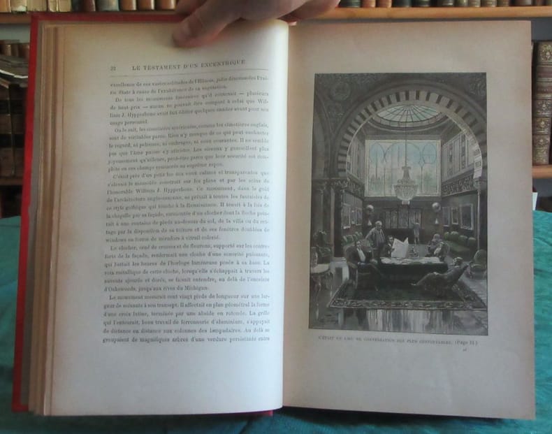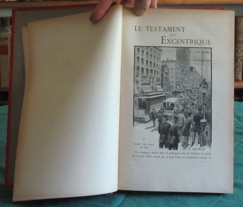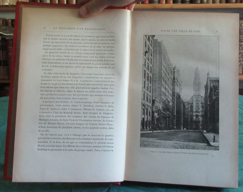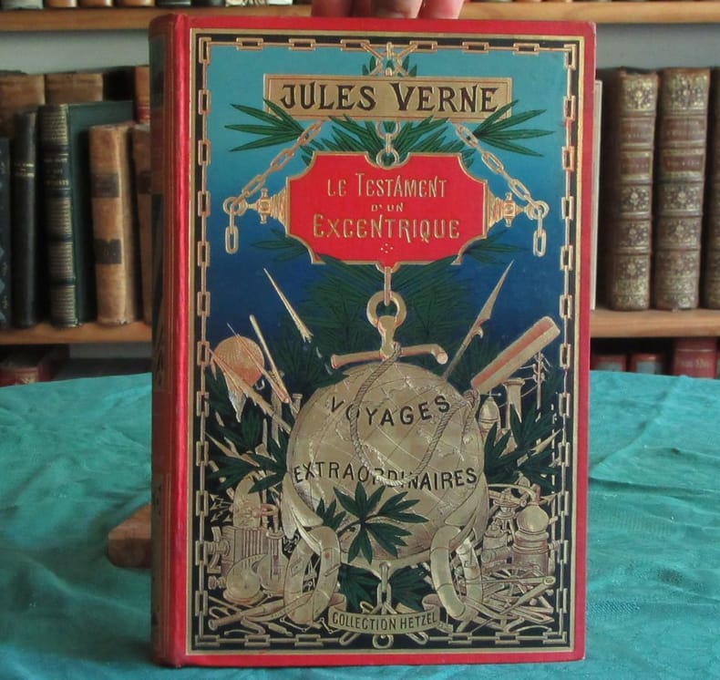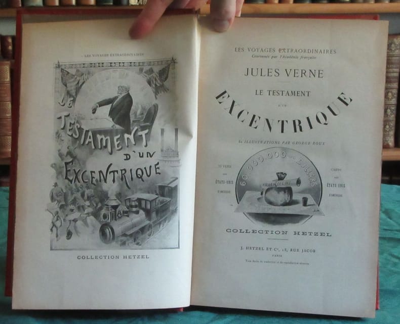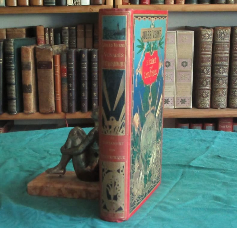 Les Voyages Extraordinaires. 61 illustrations par George Roux. 35 vues des États-Unis d'Amérique. Carte des États-Unis d'Amérique.Gravures et photographies monochromes. 20 hors texte en couleurs, gris ou sépia. Complet de la planche dépliante du jeu de l'oie.Édition originale. Paris, bibliothèque d'éducation et de récréation J. Hetzel et Cie. Collection Hetzel, non daté (1899). 479 pages. Catalogue A.V. 1899-1900. Imp. Gauthier-Villars. Relié par Engel.Cartonnage polychrome Hetzel au Globe doré. Dos au phare. Deuxième plat du 3e type, bandeau "Collection Hetzel" au dos sur fond rouge, rosace du plat inférieur indiquant JH & Cie. Tranches dorées. Gouttière irrégulière. Pas de rousseur. Très bon état. Format in-4°(28x19).