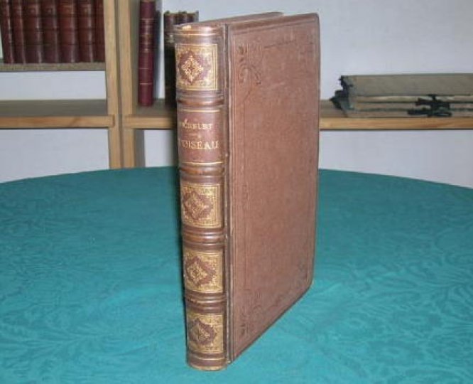 Exemplarie revêtu d'une agréable reliure du temps. Cet ouvrage constitue le premier des quatre chants de ce romantique ''poème de la nature''. En rien l'oeuvre d'un naturaliste, mais bien d'un poète, Michelet voit et salue dans les oiseaux, en place de simples produits de la nature, de véritables personnes. Ainsi fait-il ici admirer l'intelligente ingéniosité du vol de l'oiseau qui se gonfle pour monter dans l'azur. Mais aussi, la variété de son chant. Michelet décrit ensuite l'éducation de l'oiseau. L'apprentissage du vol s'apparentant d'ailleurs à celui de la marche chez l'enfant. Teinté d'anthropomorphisme, cet écrit laisse apparaître l'oiseau tel un animal doté de la raison, en proie aux passions, souffrances et amours. En résulte un morceau d'excellence. Ronsil, Bibliographie ornithologique, 2019 - Vicaire V, Manuel de l'amateur de livres du XIXème, 834 (pour l'originale de 1856). Angles et coiffe de tête légèrement élimés. Quelques claires rousseurs dans le corps d'ouvrage. Du reste, belle condition.
