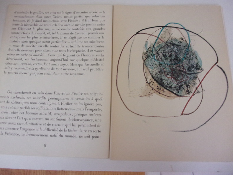 Paris, Maeght éditeur, 1974. In-folio (380 x 280 mm) en feuilles, 32 pages. 4 LITHOGRAPHIES ORIGINALES EN COULEURS DONT 2 EN DOUBLE-PAGE et 6 lithographies en couleurs dont 2 en double-page . 28 reproductions en noir. Texte de Claude Esteban " Un questionnement nécessaire". Exposition FIEDLER à la Galerie Maeght en 1974 : 28 peintures. Tirage original.