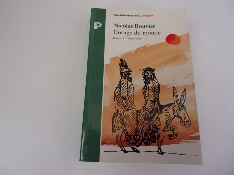 Seconde édition donnée un an après l'originale genevoise. Quelques différences : la couverture est toujours imprimée en noir et bleu mais d'une composition complètement différente, 4 cartes ont été ajoutées à la fin du volume et le nombre d'illustrations passe de 48 à 47. Les 47 dessins de Thierry Vernet, qui illustrent l'ouvrage, sont très souvent à pleine page, voire s'étalent sur deux. Ces dessins ne sont pas d'un simple illustrateur, mais bien d'un protagoniste à part entière de cette odyssée. Suisse comme lui, Vernet était déjà l'ami intime de Nicolas Bouvier avant de voyager avec lui, accumulant en chemin notes et croquis. Publié huit ans après le Tristes Tropiques de Lévi-Strauss, le premier livre de Nicolas Bouvier -ni ethnographe professionnel ni routard à l'américaine rendu aveugle et sourd à l'âpre réalité du monde par sa quête d'un improbable Nirvana- constitue la transfiguration par l'écriture de ses émerveillements de jeunesse, à travers les étendues sauvages de l'Afghanistan, premier volet d'un périple qui de sa Genève natale allait le mener jusqu'au Japon. L'Usage du monde, comme le suggère son titre, esquisse une philosophie du voyage appelée, dans la suite de l'œuvre, à se raffiner en une sorte d'éthique de l'effacement et de la disponibilité. Mais qu'on ne s'y trompe pas: ce qui aujourd'hui nous frappe le plus à sa lecture, c'est bien l'assurance précoce, la voix si forte et singulière de l'écrivain. Très bel exemplaire.