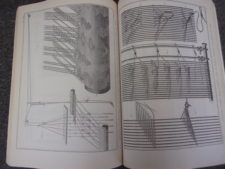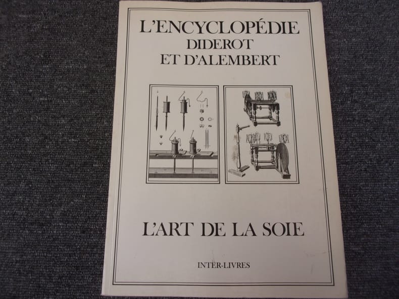 Paris, éd. Inter-Livres, 2002, gd. in-4, cartonnage souple, couv. ill. en noir éd., non paginé (190 pp.), papier crème, Très belle reproduction de l'atlas des planches sur la soie de l'Encyclopédie des techniques. La production de la soie, le matériel, la tenture et le façonnage. Comme neuf