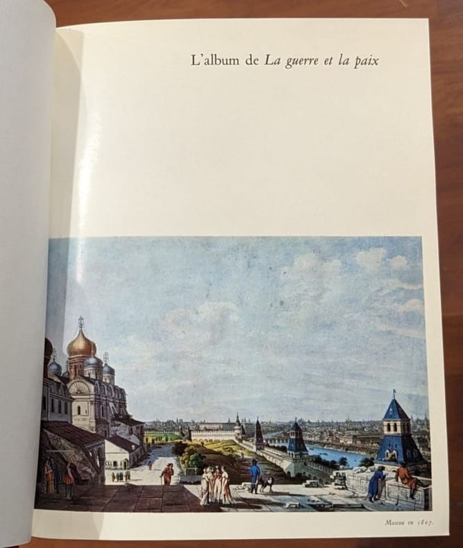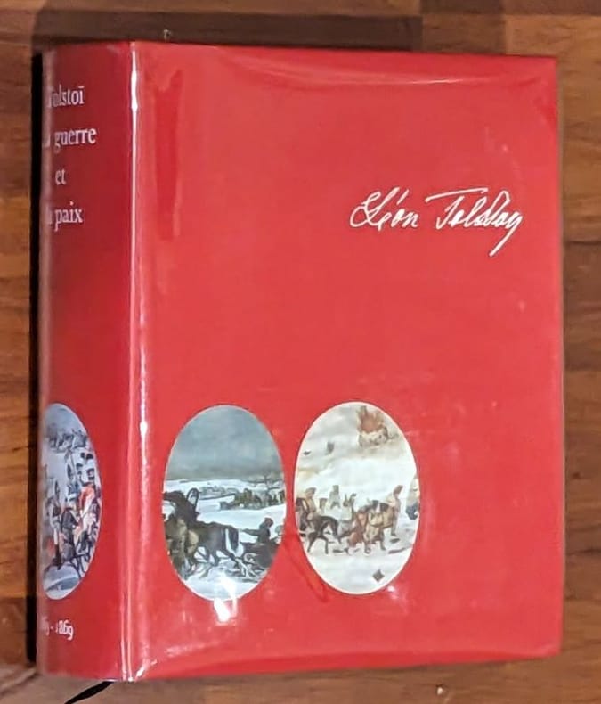 Libraires Associés / Club des Libraires de France 1963 Paris, Les Libraires Associés, Club des Libraires de France, collection Galaxie, 1963. Traduction d'Élisabeth Guettik, suivie de "L'Oeuvre devant la critique". Avec un cahier d'illustrations hors texte en noir et en couleurs de 36 pp., intitulé "L'Album de La Guerre et la Paix". Fort in-8 de 1362 pp. + tables, réalisé d'après les maquettes de Pierre Faucheux. Reliure de l'éditeur, pleine soie rouge, dos et premier plat ornés de vignettes en couleurs, titre blanc au dos, rhodoid. Édition hors commerce dont tous les exemplaires sont numérotés, réservée aux membres du Club des Libraires de France. Des accrocs en coins du rhodoid, premier plat légèrement convexe. Le reste du livre est en très bon état. Bel exemplaire malgré les défauts signalé.