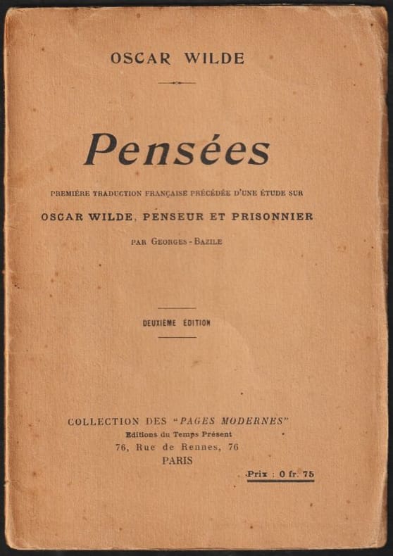 éditions du Temps Présent 1912 Paris, éditions du Temps Présent, collection des "Pages Modernes", sans date (1912). Édition originale française avec mention fictive de deuxième édition. Traduction de "The Oscar Wilde Calendar", citations réunies par Mr Stuart Mason, London, Palmer édit., 1911. Plaquette in-8 brochée de 35 pp. Une signature à l'encre en coin de la page de titre. Couverture un peu usagée, sans manques. Intérieur en très bon état, à grandes marges, non rogné.