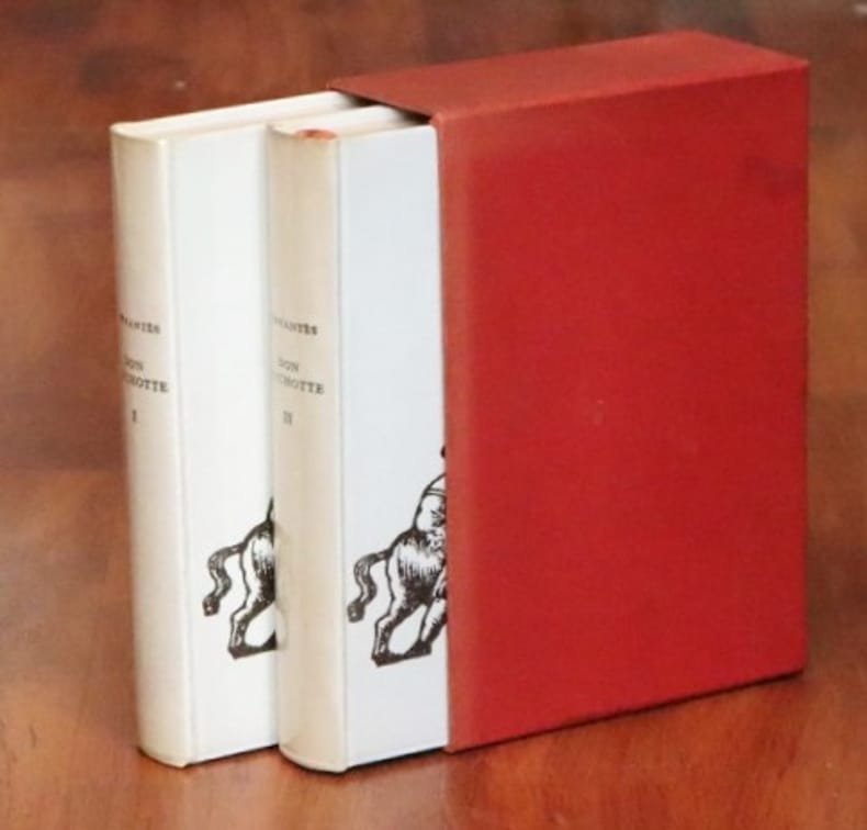 Club des Jeunes Amis du Livre 1961 Paris, La Compagnie des Libraires et des Éditeurs associés, Club des Jeunes Amis du Livre, 1961. Édition illustrée, établie par Pierre Robes d'après les documents anciens conservés à la Bibliothèque Nationale. Traduction de Louis Viardot. Deux volumes in-8 de 451 et 489 pp., comprenant de nombreuses reproductions d'après des gravures anciennes, dont 38 en pleine page. Reliures de l'éditeur, pleine toile écrue, premiers plats illustrés, rhodoid. Sous coffret cartonné rouge. Coffret légèrement sali sinon très bon état. Rhodoid sans accrocs et intérieur bien frais.