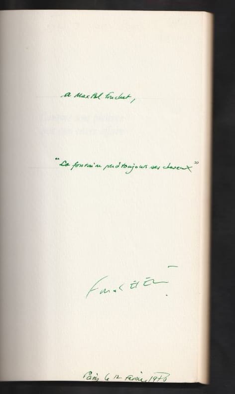 La Délirante 1970 Paris, La Délirante, 1970. Frontispice de Sam Szafran. Grand in-8 broché de 83 pp., imprimé sur Ingres d'Arjomari-Prioux. Exemplaire enrichi d'un bel envoi autographe signé de l'auteur à Max-Pol Fouchet. Très bon état.