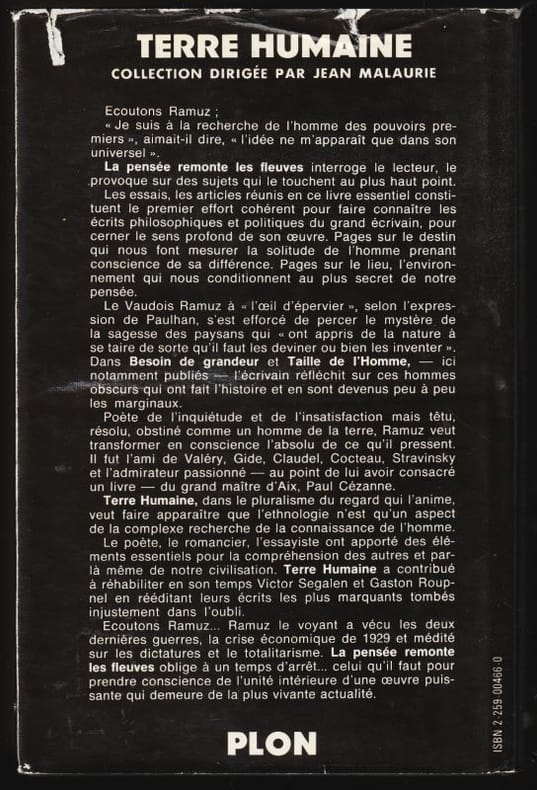 Plon "Terre Humaine" 1979, in-8 relié toile noire de l'éditeur sous jaquette illustrée, 358 p. (très bon exemplaire ; non réédité) Avec 32 illustrations HT et index. Recueil d'essais (dont Besoin de grandeur et Taille de l'homme) où l'écrivain vaudois s'efforce notamment de percer le mystère de la sagesse des paysans.