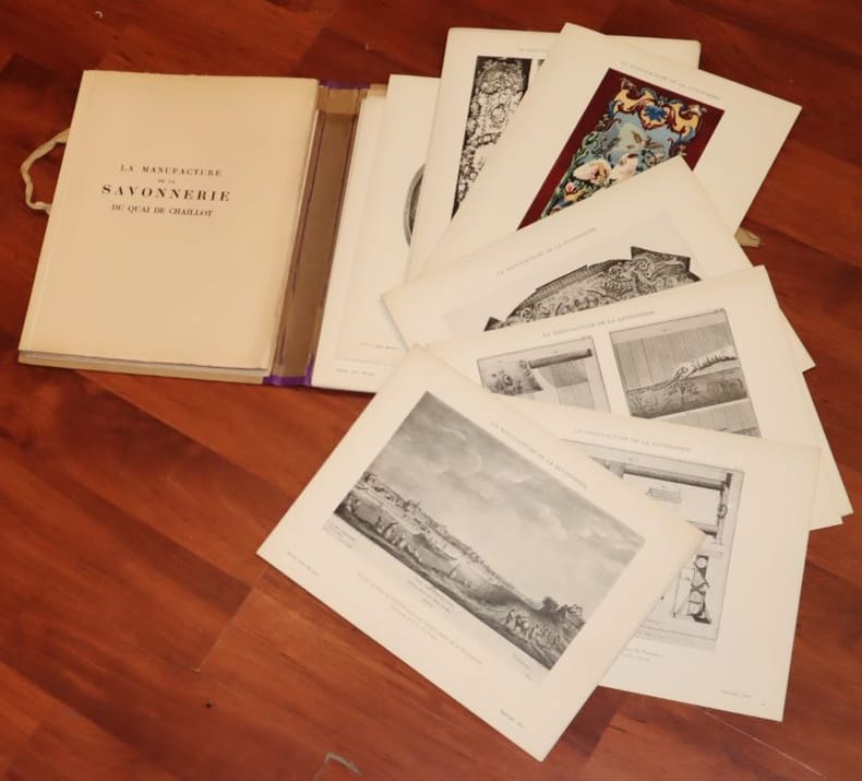 Paris, Editions Albert Morancé, sans date, 18 X 24 cm., sous chemise, 79 pp. + 32 planches. Histoire de la manufacture, depuis Henri IV jusqu'en 1826, date à laquelle elle fut rattachée à la manufacture des Gobelins. Un livret et 32 planches (certaines en couleurs) sont réunis dans une chemise cartonnée imprimée, fermée par un ruban. Livret non coupé, avec légères rousseurs sur les couvertures. Le tout en bon état.