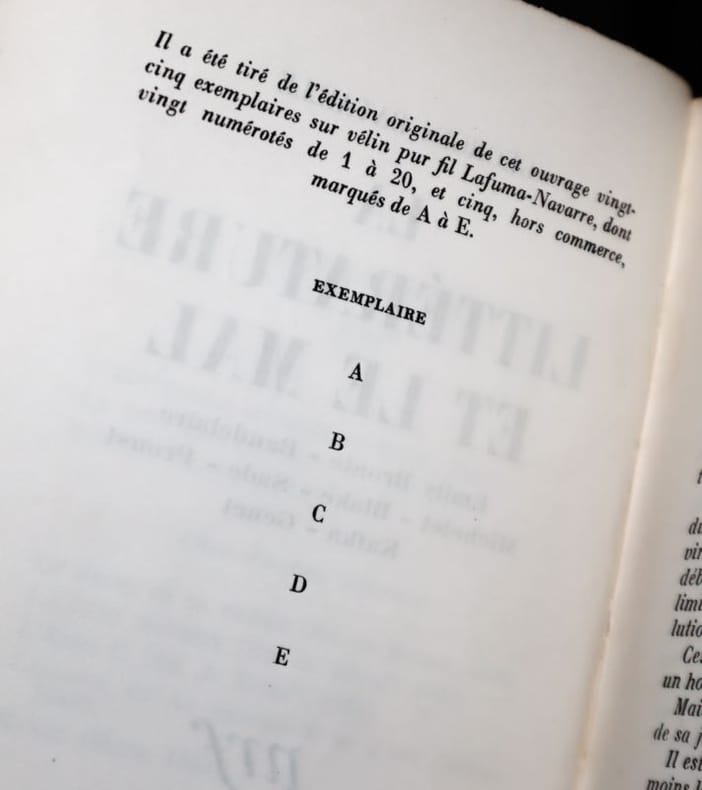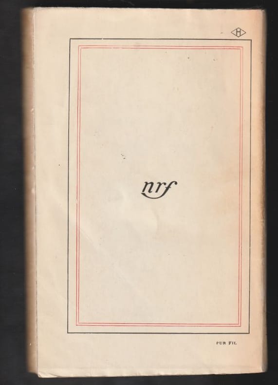 NRF Gallimard 1957 Paris, NRF Gallimard, 1957. Édition originale, un des 5 exemplaire hors commerce, lettré, parmi les 25 exemplaires de tête sur vélin pur fil Lafuma-Navarre. Notre exemplaire est lettré des 5 lettres A, B, C, D et E, disposées en colonne. Avec la mention "pur fil" au second plat. In-12 broché, 12 x 19 cm., 231 pp. Couverture légèrement salie, dos plissé et bruni, sans manque. Pages coupées. Intérieur frais et en très bon état.
