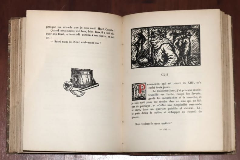 Mornay, Les Beaux Livres 1923 A Paris, chez Mornay, libraire, collection Les Beaux Livres, 1923. Édition illustrée par Barthélémy d'une centaine de bois gravés, dont un frontispice en deux tons, les autres en en-têtes, culs-de-lampe et lettrines. Le tirage est limité à 1000 exemplaires, celui-ci un des 942 exemplaires numérotés sur vélin de Rives filigrané au nom de l'éditeur. In-8 de 391 pp. Reliure demi chagrin havane, dos lisse, titre doré au dos. De rares rousseurs pâles sur les derniers et les premiers feuillets. Très bon état malgré le défaut signalé. Intérieur frais, bonne reliure.