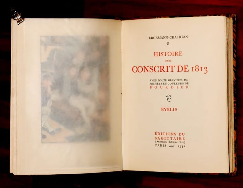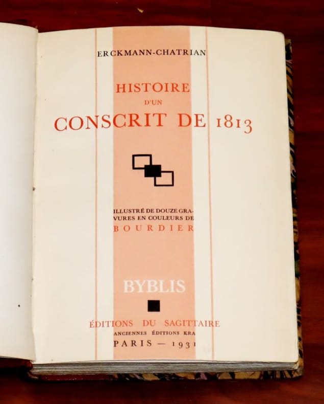 Paris Editions du Sagittaire. Anciennes Editions Kra 1931 in 8 (20,5x15) 1 volume reliure demi chagrin maroquiné havane ornée de rectangle mosaïqué, dos à 4 nerfs soulignés de filets dorés, plat suprérieur orné d'un grand rectangle mosaïqué de parchemin ivoire, illustré d'un grand dessin original à la plume figurant une cigogne sur une cheminée, tête dorée, couverture entièrement conservée, 245 pages [1], illustré de 12 gravures hors-texte en couleurs de Bourdier. Collection Byblis. Tirage à 3300 exemplaires numérotés sur vélin Aussedat. Bel exemplaire, belle et singulière reliure