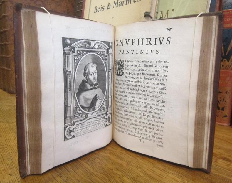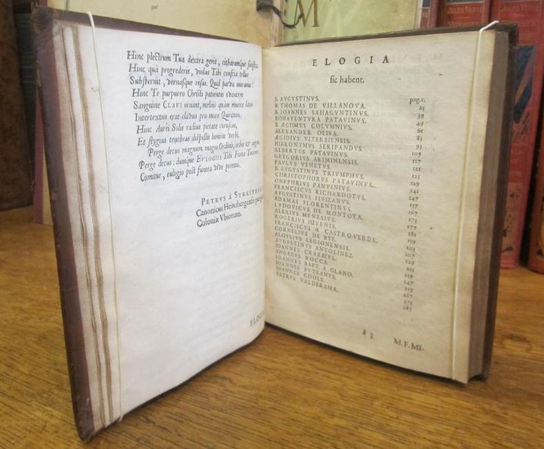 "16. Antverpiae (Antwerpen), apud Ioannem Cnobbarum, 1636, in-4°, title -page engraved by Galle after a design by Rubens + xxii nn + 288 pp, with 30 engraved portraits by Corn. Galle after drawings by Jacques Francquart. Bound with; Silvii Antoniani S.R.E. Cardinalis Vita a Iosepho Castalione I.V.D. conscripta; Eiusdem Silvii Orationes XIII, Romae, Apud Iacobum Mascardum, 1610, vii nn + 137 + 3 nn pp, contemporary full leather, raised back, blind tooled covers. Old paper title label at back. (Some wear at corners, upper joint split over 5 cm, traces of ties, but still a good/fine copy). According to the title-page, Curtius belonged to the same order and was a historiographer and ""diffinitor generalis"". In the margin of the title-page a manuscript ex-dono ""Dono D. Joannis Cnobbari""; manuscript ex-libris ""Boek van Soctis Iesu Bruxellis ..."". (Title-page design see Corpus Rubenianum, Judson & Van de Velde, pp. 68, ills. 23)."