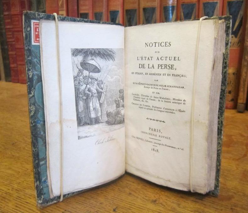 ÉDITION ORIGINALE de ce RARE OUVRAGE TRILINGUE, contenant deux feuillets de titre distincts dont l'un orné d'une vignette gravée et coloriée et de DEUX PLANCHES hors-texte gravées et finement coloriées. L'une représente l'auteur, ambassadeur du roi de Perse en 1816, l'autre Khatchadour d’Hovhannès, officier royal du prince royal de Perse. Tous les deux sont arméniens et ont participé à l'ambassade envoyée en France en 1816. L'exemplaire est conservé dans une pleine reliure de l'époque signée "P. MESLANT", relieur parisien ayant exercé dès 1797, réputé pour la qualité de son travail et qui réalisa notamment des reliures pour Louis-Philippe Ier et plusieurs membres de la famille d'Orléans. (Chadenat, 920 & 2411 - Pas dans Gay ni Hage-Chahine - Fléty, 128). BEL EXEMPLAIRE, en PARFAIT ÉTAT, en pleine reliure signée de l'époque, CONDITION RARE. FINE COPY. PICTURES AND MORE DETAILS ON REQUEST.