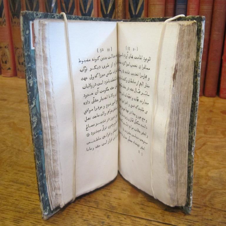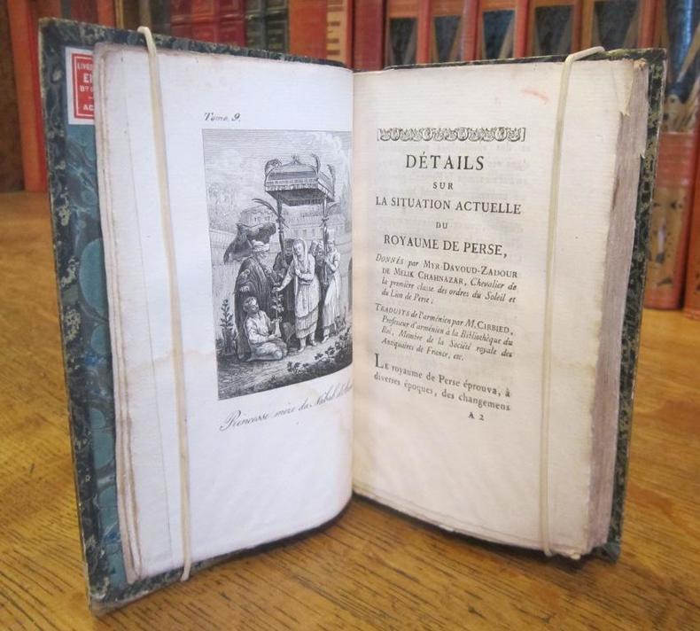 In-12 (10 X 9,8 cm), 4, 360 pp., demi-basane verte, dos a 4 nerfs ornes de filets or (relie vers 1840). Illustre d'un frontispice (Chah Jehan) et une gravure additionnelle (Princesse mere da Nabab d'Areate). Contient egalement : "Recit d'un acte de tolerance religieuse exercee a Tauryz" par M.Cierbied, Professeur royal d'armenien, et Membre de la Societe royale des Antiquaires de France et "Apercu general de la Perse, par L. Langles, chevalier de Saint-Wladimir, Conservateur-Administrateur des manuscrits Orientaux de la Bibliothèque du Roi, Membre de l'Institut, etc. (mouillure claire a l'angle inferieur des feuillets du debut ).