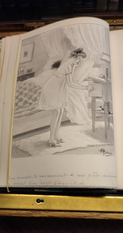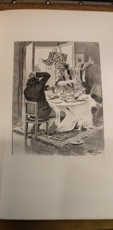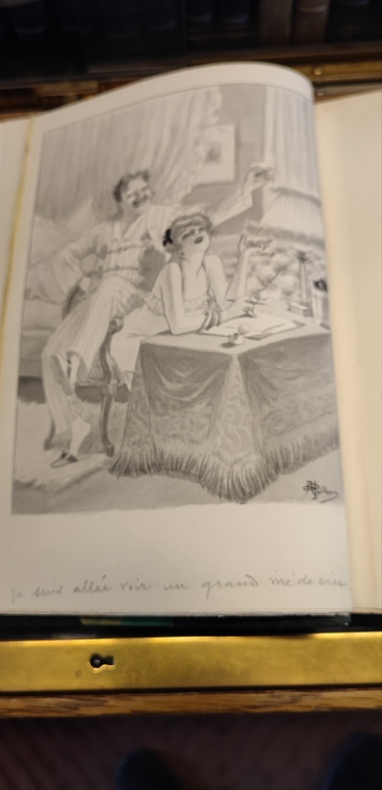 Les Pharmaciens Bibliophiles, 1935. in-4 ,25 x 20 cm.), 303 pages, demi-maroquin vert, coins, tête dorée, dos orné, couverture et dos conservés (reliure signée Yseux, successeur de Thierry-Simier, dos légèrement passé). Edition originale posthume, tirage limité à 175 exemplaires, celui-ci un des 150 numérotés au nom des Sociétaires. 37 vignettes et 18 illustrations par Albert Guillaume en noir et blanc gravées par Raoul Serres. Exemplaire enichi de deux dessins aquarellés et signés par Albert Guillaume. Ex-libris du Docteur René Ravaud.
