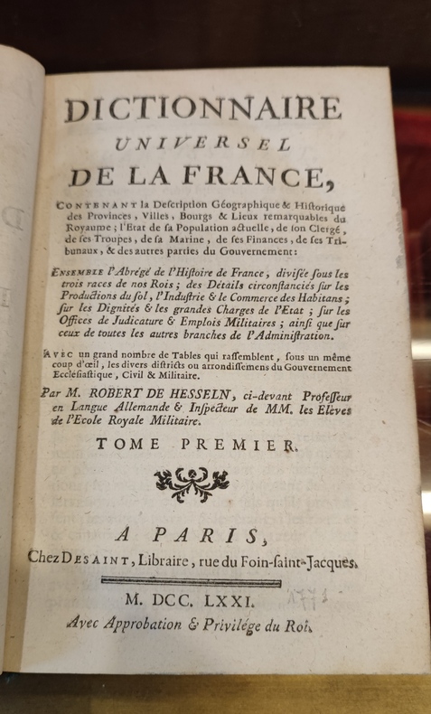Desaint Relié 1771 6 volumes in-12 reliés de XVI-664 pages ; (4)-680 pages ; (4)-675-(1) pages ; (4)-714 pages ; (4)-659-(1) pages ; (4)-645-(3) pages, basane havane marbrée, dos orné à nerfs, pièces de titre en maroquin rouge et pièce de tomaison de maroquin noire (reliure de l'époque). Edition originale. Ouvrage donnant un tableau complet de la France sous l'Ancien Régime. « Guide donnant un aperçu excessivement détaillé, outre la partie géographique, de tout ce qui peut être considéré comme administratif. Nombre d'habitants des lieux énumérés » (INED, 2270). Mors et coiffes abîmés, dos un peu frottés, petits manques aux coiffes inférieures des tomes 2 et 6 et au premier plat des tomes 4 et 5, coins et plats frottés, une mouillure sur la page de garde de la majorité des volumes, la mouillure a entraîné une dégradation du papier en marge sur les premières pages du tome 3, état correct. Livraison a domicile (La Poste) ou en Mondial Relay sur simple demande.