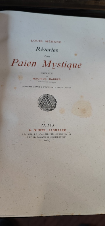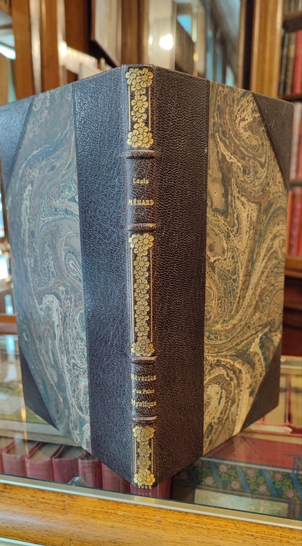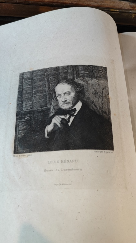 1909 Paris, A. Durel, 1909. In-8, demi-maroquin brun à coins, dos à nerfs, tête dorée, couv. et dos conservés (Yseux, succ. de Thierry-Simier). Édition de luxe, illustrée d'un portrait de l'auteur gravé à l'eau-forte par G. Noyon. Ce recueil de 30 poèmes et articles parut en 1876 ; selon Maurice Barrès dans sa longue préface pour cette nouvelle édition, cette oeuvre d'un "polythéisme mystique", est cette "haute poésie essentielle, ce triple extrait d'Athènes, d'Alexandrie et de Paris". Chimiste, éminent helléniste, poète, ami de Baudelaire et Leconte de Lisle, Ménard publia dans Le Parnasse contemporain.Tirage à 240 exemplaires ; un des 20 réimposés sur Chine, avec un 2e état, avant à la lettre, du portrait.Ex-libris de Joseph Aslan Cattaui Pacha, industriel et homme politique égyptien (1861-1942).