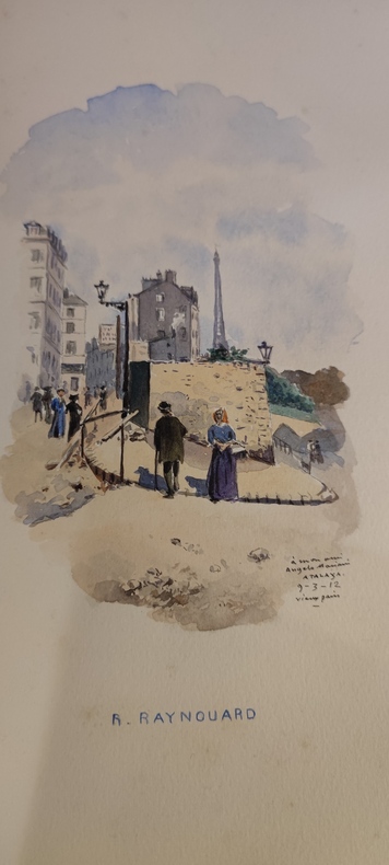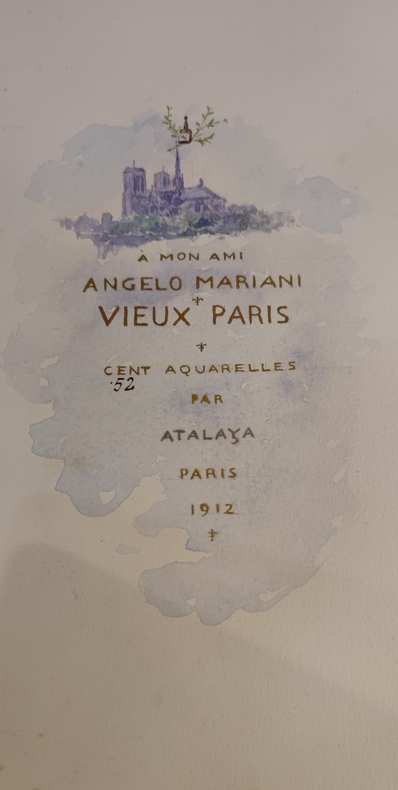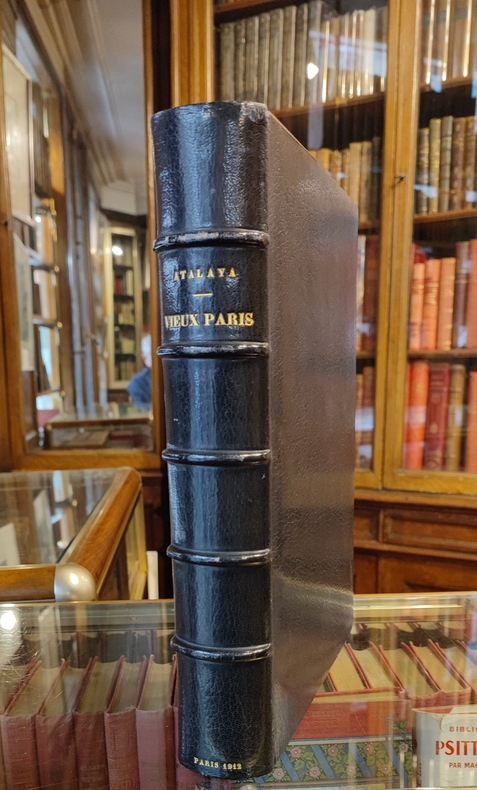 Album in-4 (32 x 26cm), maroquin noir, signé Noulhac, contenant 152 étonnantes et aquarelles représentant des rues de Paris de divers quartiers (16ème, 5ème, Ier, etc.), de format moyen de 9 x 15 cm, signées et dédicacées à l'homme d'affaires Angelo Mariani, ami et commanditaire de l'artiste, auteur de ces aquarelles. Ces aquarelles représentent fidèlement les endroits, les monuments et les rues de Paris et sont un témoignage artistique et historique précieux1912du Paris de la Belle-Epoque. Chaque aquarelle est légendée par le peintre, à la plume. (album protégé par un étui bordé) Quelques noms de rues : PASSY, AUTEUIL, RAYNOUARD, BOULAINVILLIERS, BERTON, RANELAGH, CHERNOVIZ, VAN LOO, SAINT-JACQUES, MAUBERT, ROLLIN, VIARMES, ARRAS, SAINT-BON, etc...