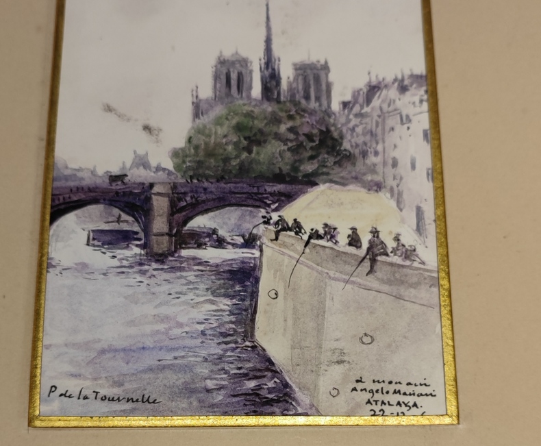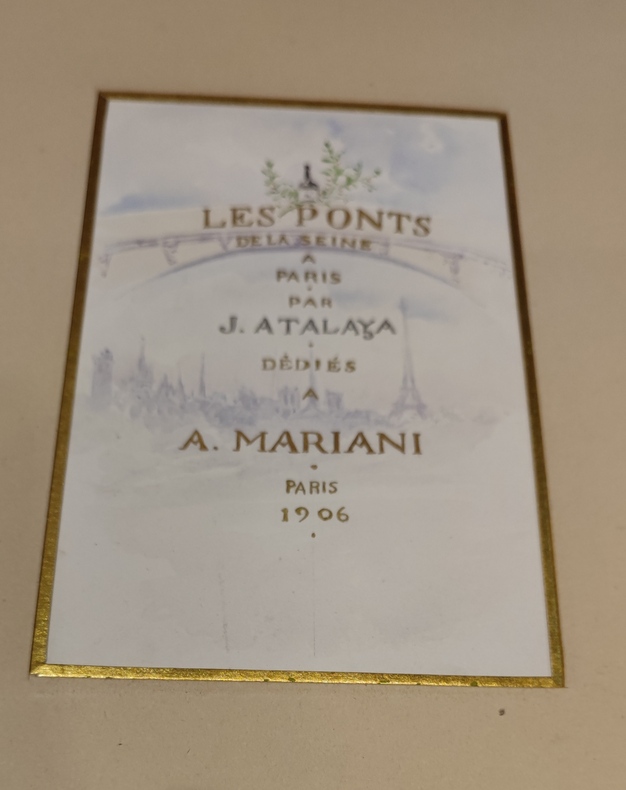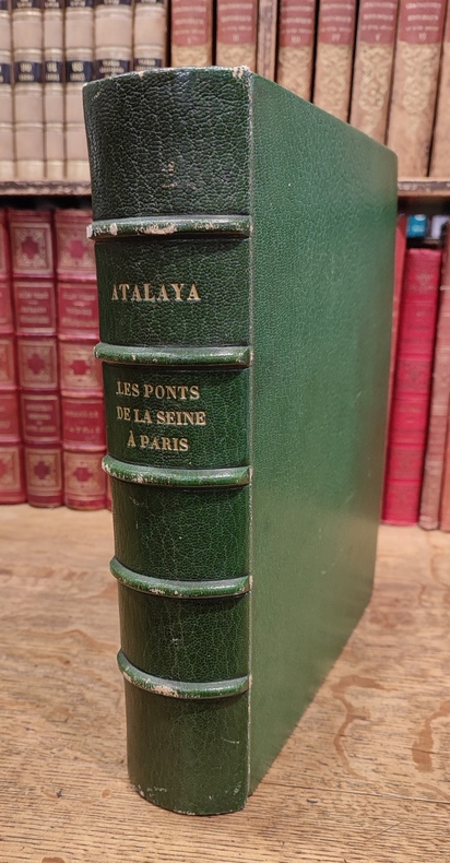 in-4 (31 x 27 cm), reliure maroquin vert pomme, signée Noulhac, tranches dorées. Album in-4 (32 X 26 cm), contenant 52 étonnantes et fidèles aquarelles originales représentant les ponts de Paris signées et dédicacées à l'homme d'affaires Angelo Mariani, ami et commanditaire de l'artiste, auteur de ces aquarelles qui représentent fidèlement les ponts de Paris à la Belle Epoque. Chaque aquarelle (format 9 x 13,5 cm=) est légendée par le peintre, à la plume. Voici quelques Ponts : ALEXANDRE III - SULLY - PASSERELLE DES ARTS - PONT NEUF - PONT AU CHANGE - PONT NOTRE DAME - AUSTERLITZ - VIADUC D'AUTEUIL- PONT MIRABEAU - MARCHE AUX FLEURS - IENA - GRENELLE - PONT MARIE - ALMA - garigliano - PONT MIRABEAU - etc...