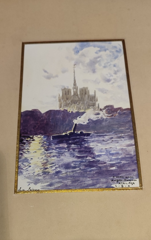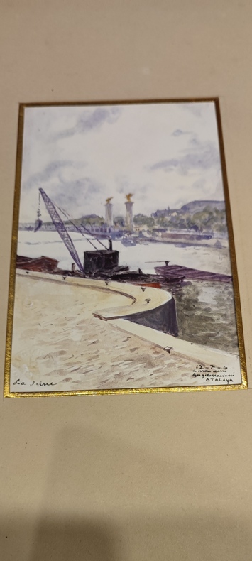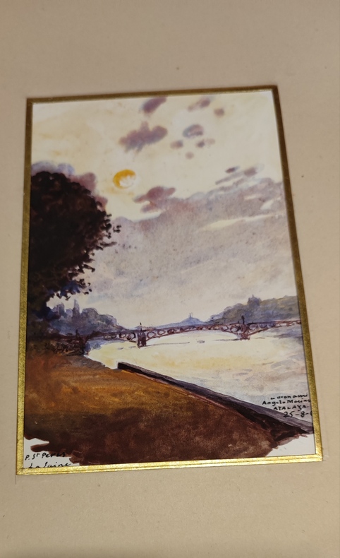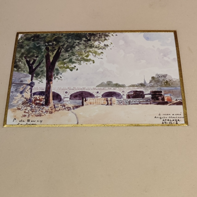 in-4 (31 x 27 cm), reliure maroquin vert pomme, signée Noulhac, tranches dorées. Album in-4 (32 X 26 cm), contenant 52 étonnantes et fidèles aquarelles originales représentant les ponts de Paris signées et dédicacées à l'homme d'affaires Angelo Mariani, ami et commanditaire de l'artiste, auteur de ces aquarelles qui représentent fidèlement les ponts de Paris à la Belle Epoque. Chaque aquarelle (format 9 x 13,5 cm=) est légendée par le peintre, à la plume. Voici quelques Ponts : ALEXANDRE III - SULLY - PASSERELLE DES ARTS - PONT NEUF - PONT AU CHANGE - PONT NOTRE DAME - AUSTERLITZ - VIADUC D'AUTEUIL-NT MIRABEAU -
