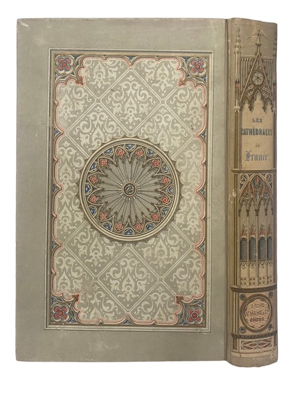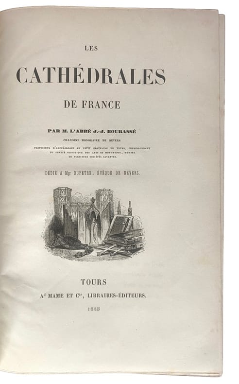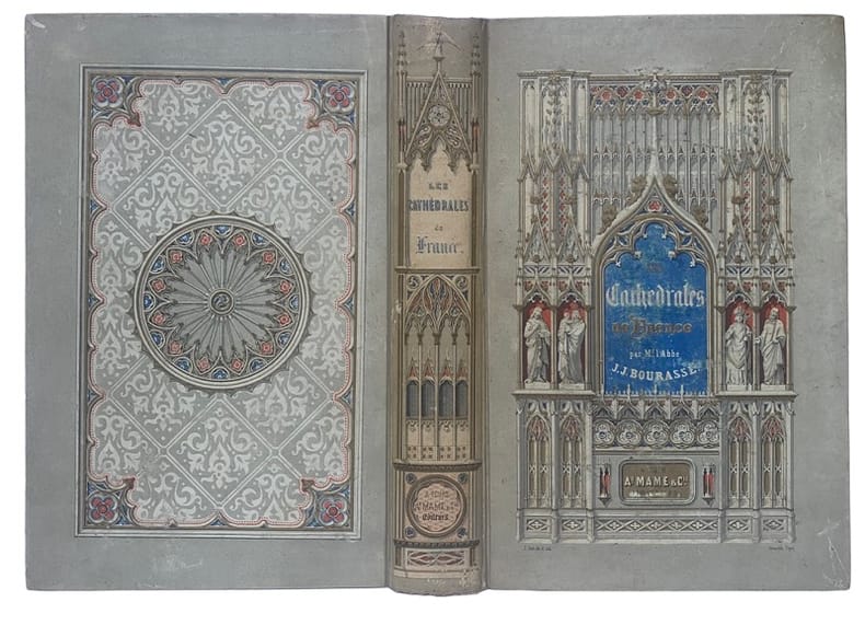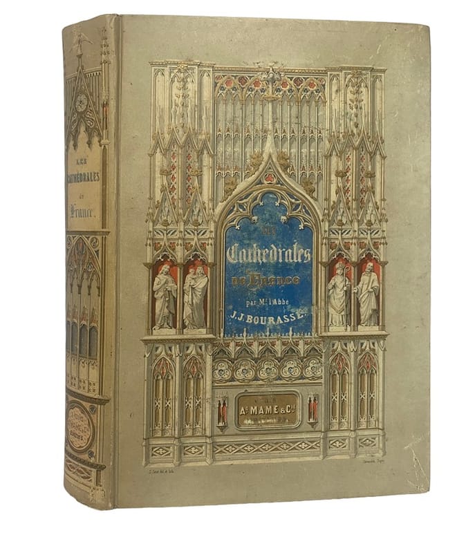 Édition originale de cet ouvrage du chanoine et archéologue Jean-Jacques Bourassé (1813-1872) qui se proposait de présenter une esquisse générale des principales cathédrales de France, depuis les plus anciennes et les plus belles jusqu’aux plus modestes.L’auteur y donne un historique et une description de chacune d’elles. L’édition est illustrée d’un frontispice en chromolithographie par Jetot, de plusieurs vignettes dans le texte et en cul-de-lampe et de 9 planches, l’une d’elles gravée sur cuivre sur chine collé. Exemplaire en cartonnage papier de l’éditeur illustré sur chaque plat et au dos d’une chromolithographie d’après Jetot, très bien conservé malgré d’infimes frottements et les charnières intérieures fendues. Déchirure à la chemise avec manques. Rousseurs éparses, plus prononcées sur les planches.