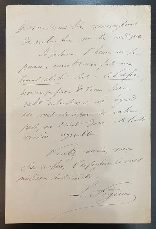 Prolifique auteur d’ouvrages de vulgarisation scientifique, Louis Figuier (1819-1894) souhaite faire l’annonce de la parution de son dernier ouvrage intitulé Connais-toi toi-même, notions de physiologie à l'usage de la jeunesse et des gens du monde dans le Journal Illustré ainsi que dans La Presse. Il s’adresse pour cela à l’un de ses confrères : « J’ai laissé pour vous au bureau du Journal illustré, un exemplaire de l’ouvrage que je viens de publier Connais-toi toi-même, notions de physiologie à l'usage de la jeunesse et des gens du monde. Je serai très heureux que le Journal illustré voulût bien consacrer un article à cet ouvrage et faire paraître quelques gravures comme spécimen de son illustration. »L’ouvrage en question parut l’année suivante chez Hachette avec de nombreuses illustrations d’après Gilbert Massard.Bibliographie : Caillet, 3917.