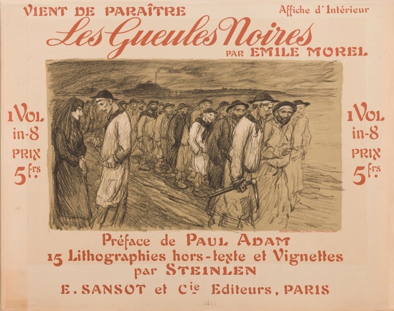 Lithographie 445 x 560 mm.Très belle épreuve sur vélin mince ivoire, de cette célèbre « affiche d’intérieur » de librairie, publiée à l’occasion de la sortie de l’ouvrage Les Gueules noires d’Émile Morel chez Sansot et compagnie en 1907, illustré par Steinlen.L’illustration est celle que l’on retrouvera sur la couverture du livre.Crauzat 515.