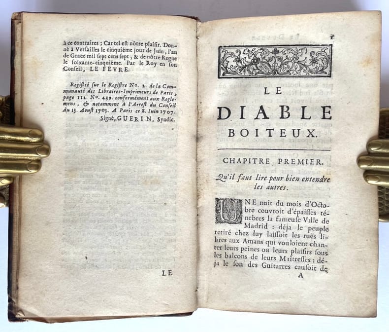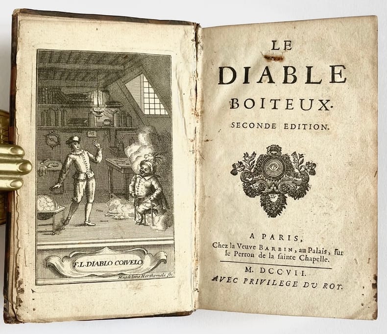 Véritable seconde édition parue la même année que la rarissime édition originale.Inspiré d’ El Diablo cojuelo de l’auteur espagnol Luis Vélez de Guevara, Le Diable boiteux apporta la renommé et un succès considérable à Alain-René Lesage (1668-1747).Premier tirage qui se distingue entre autres par une faute de syntaxe page 182 « Il semble que le ciel vous ait envoyé ici pour à détourner » au lieu de « pour détourner » dans le second tirage.Dans son étude sur Le Diable Boiteux, intitulée Étude de bibliographie matérielle Roger Laufer indique (page 24) que : « Le texte a été revu et augmenté, la composition aérée par l’introduction de nombreux paragraphes ; le chapitre, xv perd 4 pages, le chapitre xvi en gagne 4 et se trouve divisé en deux parties qui forment les nouveaux chap, xvi et xvii. »L’exemplaire est enrichi d’un frontispice gravé, tiré de l’édition originale, signé en bas à droite Magdeleine Horthemels.Coins émoussés avec manques, coiffe inférieure arasée, petites fentes aux charnières. Quelques salissures et rousseurs éparses ainsi que plusieurs tâches d’encre dont une sur le titre qui a légèrement perforé le feuillet. Premier feuillet de garde et frontispice en partie défaits. Littérature XIXe, Toulouse, Poésie