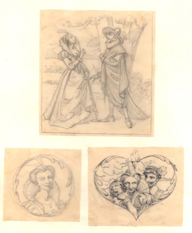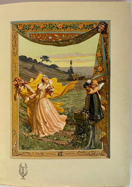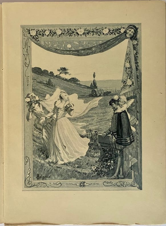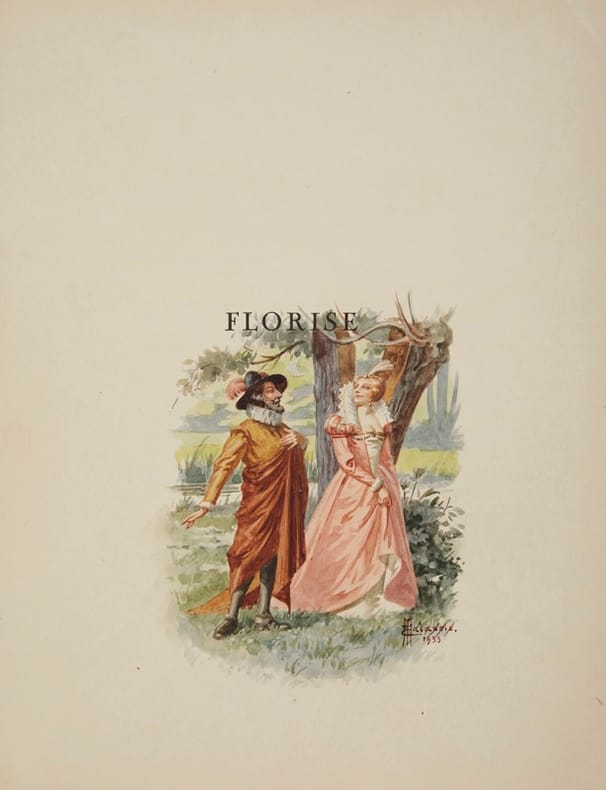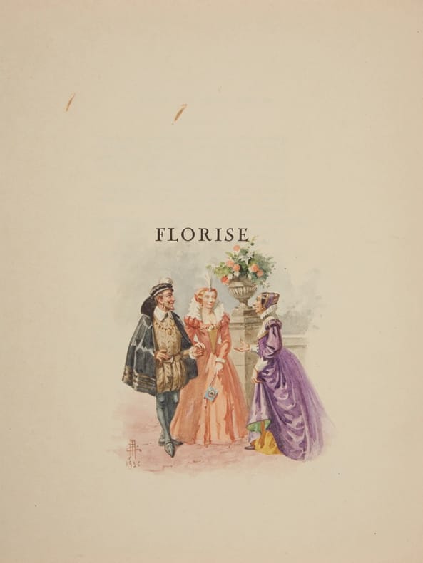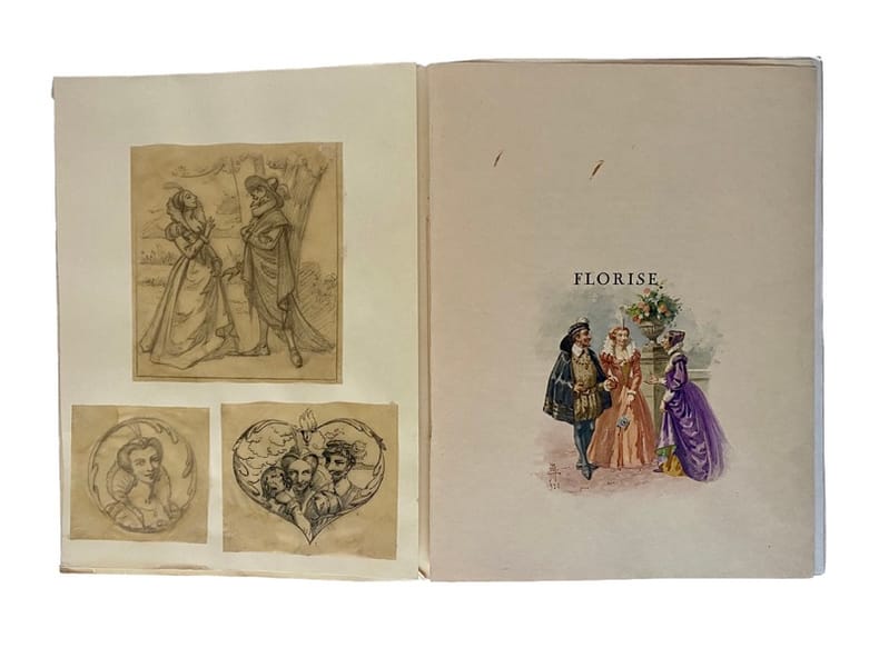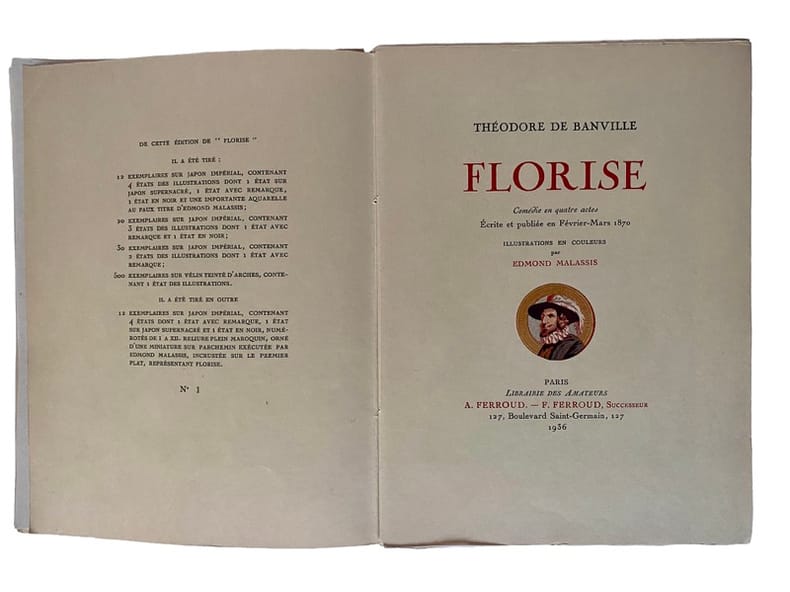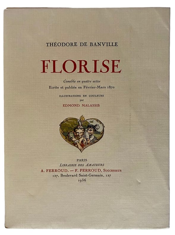 Charmante édition de cette comédie de Théodore Banville écrite en 1868 et parue pour la première fois en 1870. Elle est illustrée de nombreuses compositions en couleurs d’Edmond Malassis (1874-1944), dont cinq hors texte.Tirage limité à 564 exemplaires.Un des 12 de tête imprimés sur Japon impérial, celui-ci portant le numéro 1, contenant 4 états des illustrations et une importante aquarelle de Malassis sur le faux titre. Il a été exceptionnellement enrichi des éléments suivants : - deux portraits de Théodore de Banville gravés sur cuivre, tirés sur chine, - le feuillet de faux-titre de l’exemplaire n°7, orné d’une aquarelle originale signée et datée de 1936. Elle représente trois personnages devisant devant un muret orné de fleurs,- trois croquis préparatoires sur calque (deux à la mine de plomb et un à la plume), contrecollés sur un papier japon. Le plus grand (90 x 100 mm) représente les deux personnages figurant sur l’aquarelle du faux titre. Les deux autres (50 x 50 mm et 70 x 60 mm) sont le cul-de-lampe de la page 47 ainsi que l’illustration qui orne la couverture.Exemplaire en partie non coupé. Le premier cahier est débroché.