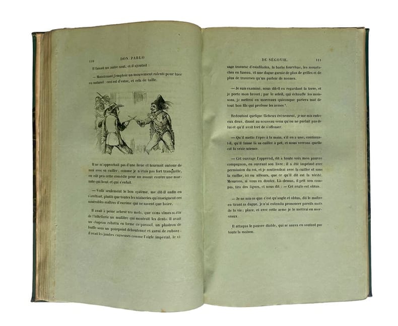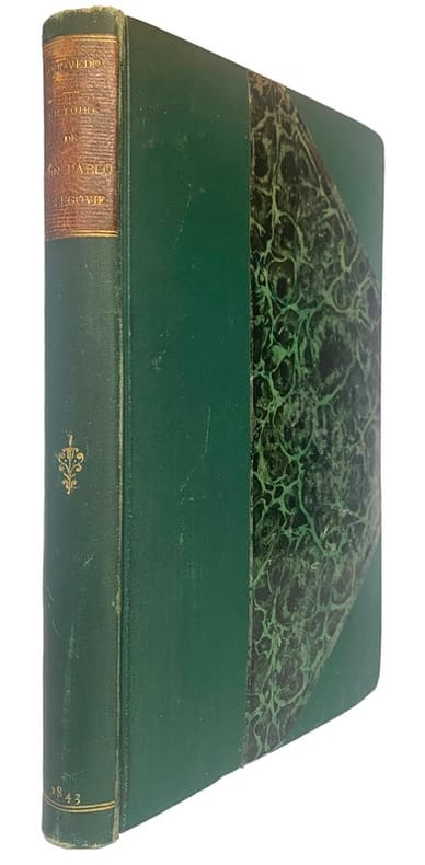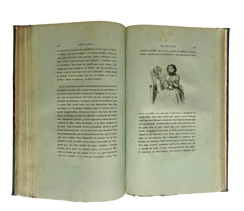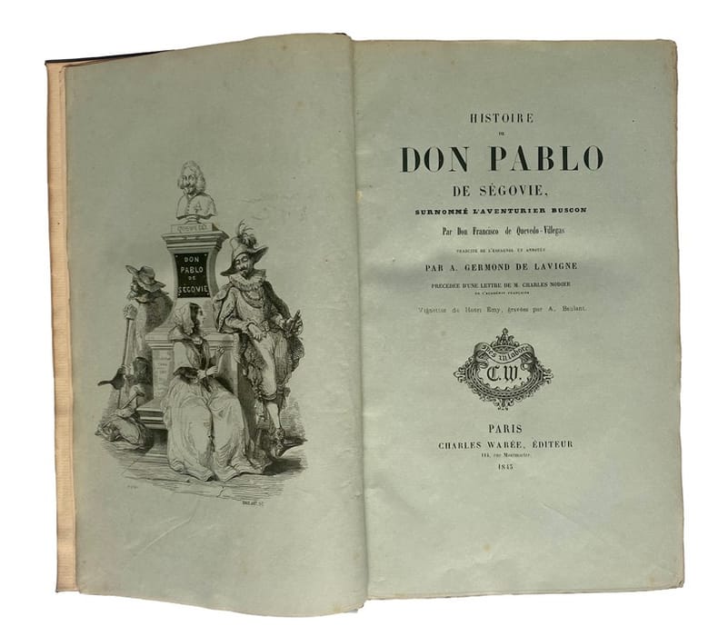 Première édition de la traduction par Germond de Lavigne de ce roman picaresque de l’écrivain espagnol Francisco de Quevedo (1580-1645). L’édition débute par une lettre-préface du traducteur à Charles Nodier dans laquelle Germonde de Lavigne donne un historique de l’œuvre et décrit les différents aspects de sa traduction. Cette lettre est suivie de la réponse élogieuse de Charles Nodier.L’illustration, en premier tirage, est constituée d’un frontispice et de nombreuses vignettes dans le texte, gravés sur bois par Baulant d’après les compositions de Henri Émy.Rare exemplaire imprimé sur papier bleu.Frottements d’usage aux coiffes et aux coins. Quelques rares rousseurs.