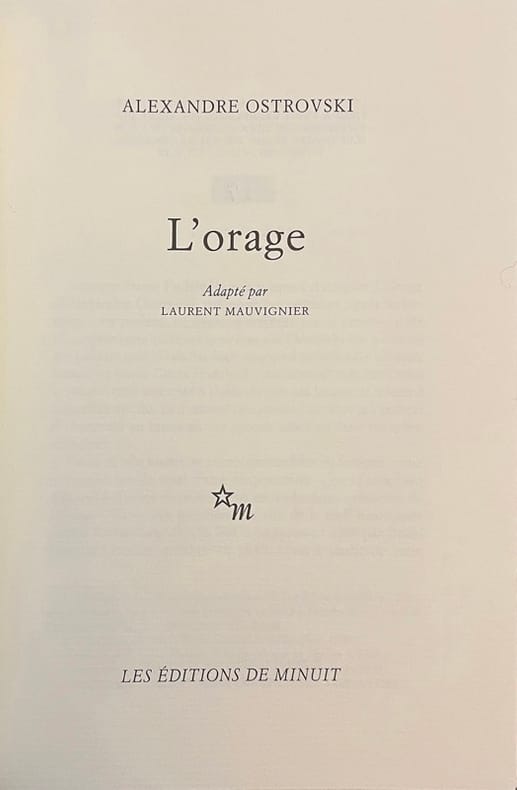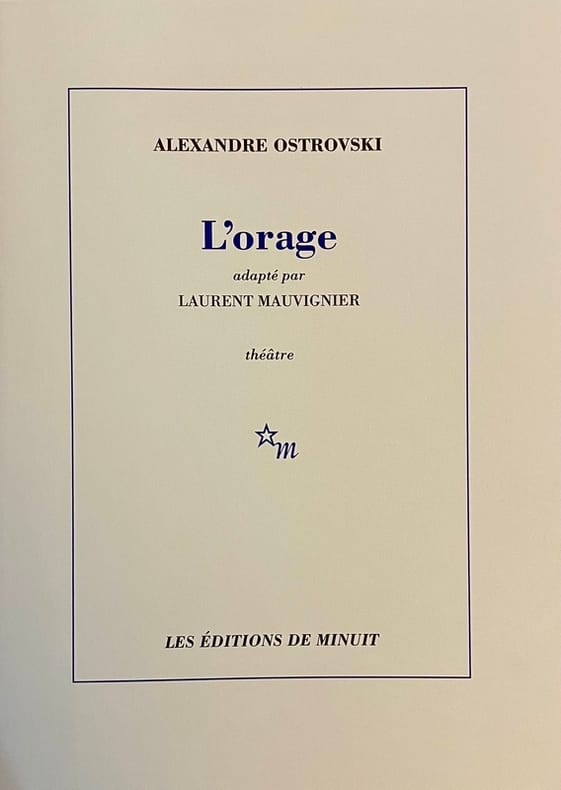 Édition originale de cette adaptation par Laurent Mauvignier de L’Orage d’Ostrovski, transposant la pièce du XIXe siècle au XXIe. Elle fut représentée pour la première fois dans cette version sur la scène du Théâtre des Bouffes du Nord à Paris, du 12 au 29 janvier 2023, dans une mise en scène de Denis Podalydès.Un des 24 exemplaires numérotés sur vergé des papeteries Schleipen, seul tirage sur grand papier.