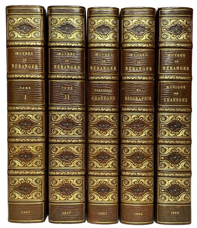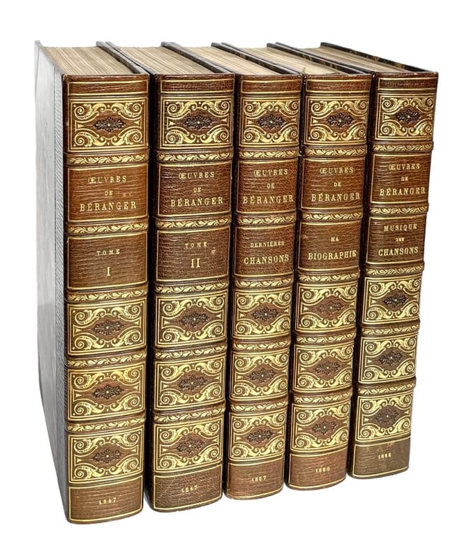 Paris, Perrotin, 1847 6 volumes in-8 de (4) ff. (dont 2 fac-similé de lettre), XL 407 pp., (2) ff., 24 couvertures de livraisons de papier jaune imprimées et gravées. - (2) ff., 401, (1) pp., (1) f., 25 couvertures de livraisons de papier jaune imprimées et gravées. - (2) ff., III, 374 pp., (2) ff., 8 pp. du catalogue Perrotin. - (2) ff., 416 pp., 8 pp. du catalogue Perrotin. - (3) ff., 344 pp. - 159 pp., maroquin marine, dos unis ornés de caissons de fleurons dorés aux petits fers et frappés aux centres de lyres dans des losanges. couvertures et dos conservés (Mercier Sr de Cuzin). Les dos sont absolument uniformes mais chaque série possède une décoration particulière des plats et des doublures : Chansons I et II : plats ornés de filets d'encadrement dorés, fleurons d'angles, doubles filets sur les coupes, doublures de maroquin rouge, dentelles intérieures, gardes de soie rouge, tranches dorées sur témoins. Dernières chansons et Biographie : filets dorés en encadrement sur les plats, doubles filets sur les coupes, dentelles intérieures, tranches dorées sur témoins. Musique et Supplément : demi maroquin marine à coins bordé d'un filet doré, têtes dorées, non rognés.