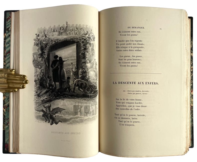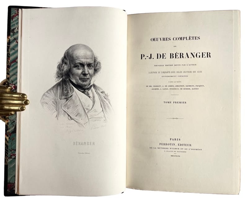 - Oeuvres complètes : 2 volumes à la date de 1851. 2ff.-XLpp.-411pp. - 2ff.-401pp. - 53 gravures y compris le portrait. - Il s'agit d'un retirage de l'édition Perrotin de 1847, illustrée par la célèbre "suite de Lemud". - Musique des chansons de Béranger. Airs notés anciens et modernes. Sixième édition augmentée de la musique des nouvelles chansons et de trois airs avec accompagnement de piano par Halévy et Mme Mainvielle-Fodor. 1853, 2ff.-292pp.- Portrait, fac-similé et 83 (sur 84) gravures. Le tout imprimé sur papier fort. - Retirage de l'édition Perrotin 1847, avec la suite dite "Grandville". - Dernières chansons de P.-J. de Béranger de 1834 à 1851 : 1857, 2ff.-IIIpp.-374pp.-1f. d'annonces. Édition originale. Sans les 14 figures de Lemud, publiées en 1860 et généralement jointes à cette édition. - Ma biographie. Ouvrage posthume de P. J. de Béranger avec un appendice et un grand nombre de notes inédites de Béranger sur ses chansons. Deuxième édition, augmentée des notes (pp. 332 à 399). 1858, 2ff.-399pp.- Portrait. - Sans les 8 gravures et la photographie publiées en 1860. - 3 gravures ajoutées pour le volume "Musique des chansons...". Ensemble bien relié. Quelques rousseurs claires.