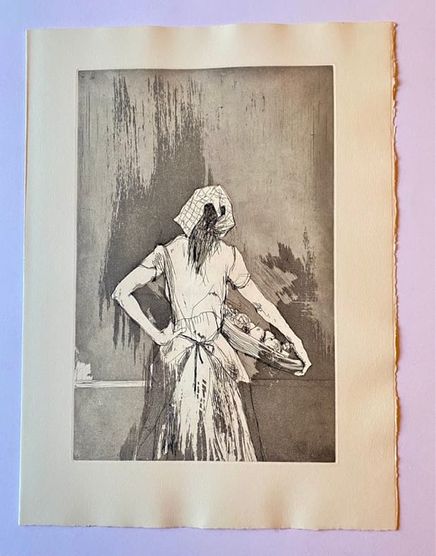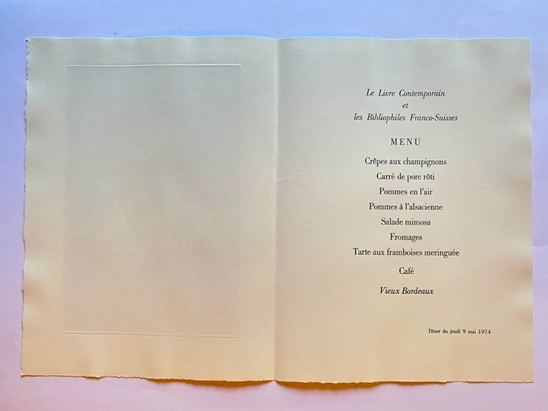 Menu original tiré sur papier vélin de Rives, du dîner donné le 9 juin 1974 par « Le Livre contemporain et Les Bibliophiles Franco-Suisses » à l'occasion de la sortie du livre « Solitude de la pitié » de Jean Giono.Il est illustré d'une eau-forte originale du peintre Jean JANSEM (1920-2013).Exemplaire très bien conservé.