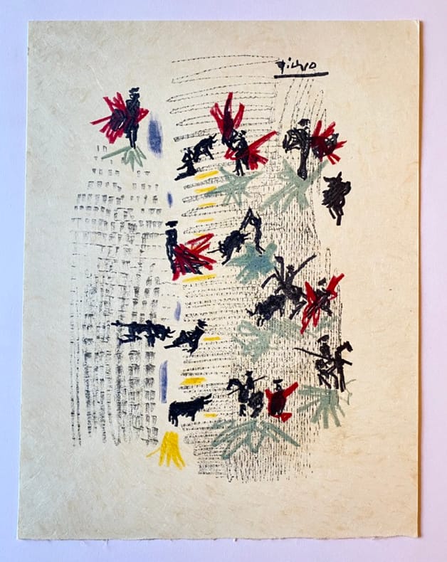 Rare épreuve sur japon nacré de ce bois en couleurs d'après Pablo PICASSO, signé dans la planche, issue de l'ouvrage « Chant funèbre pour Ignacio Sanchez Mejias » de Federico Garcia Llorca, publié par Jean de Tartas en 1976.Exemplaire très bien conservé.