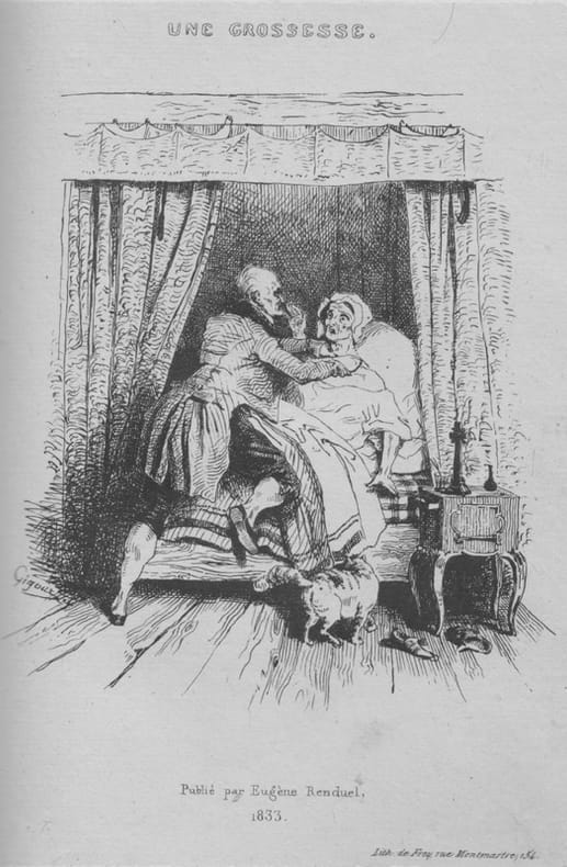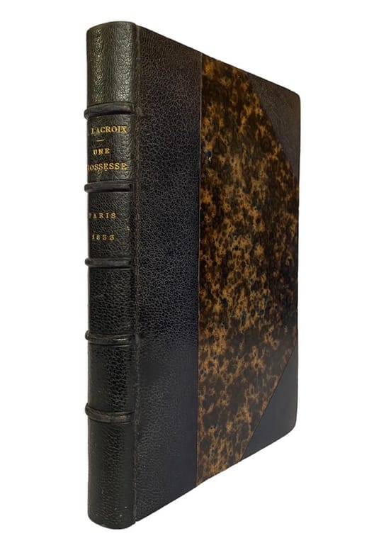 Édition originale dédiée par l’auteur à son frère Paul Lacroix plus connu sous le pseudonyme du Bibliophile Jacob.Une Grossesse est un roman de mœurs percutant, loin des clichés littéraires de son époque. L’auteur y aborde sans complaisance l’adultère et ses conséquences, en peignant le drame d’un vieillard trahi, dont la douleur se mue en une vengeance implacable. À travers des personnages profondément humains — le mari trompé, l’épouse infidèle, le séducteur puni —, Lacroix crée une œuvre émouvante et morale, où la tragédie familiale devient le miroir d’une société en crise.Son style, à la fois vigoureux et nuancé, tranche avec la littérature frivole de l’époque. Ce roman, marquant par sa sincérité et sa force dramatique, révèle un auteur engagé, capable de redonner une dimension éthique au genre romanesque.L’auteur s’adresse à son frère dans une émouvante préface où il confesse vouloir « faire, pour ainsi dire, l’anatomie d’un cœur de père, en remuer les fibres les plus secrètes, les plus sensibles ». Il ajoute que c’est « dans tes livres que je peux apprendre à nouer solidement une action, sans jamais en embrouiller le fil, à créer de ces caractères, types en naissant, qui reflètent leur époque… ».L’édition est illustrée en frontispice d’une lithographie originale de Jean Gigoux sur papier de chine collé. Elle représente M. D’Escas étranglant sa femme Léontine après avoir appris qu’il n’était pas le père de l’enfant qu’ils ont eu.Bon exemplaire relié par Allô.Dos habilement reteinté.Provenances : Étienne Cluzel, écrivain et bibliophile français, avec son ex-libris. - Ex-libris volant, non identifié, imprimé sur papier japon superfin représentant le monogramme MMC sur un échantillon de bobine de film. - Monogramme HL cerclé d’un filet noir sur la première garde.Bibliographie : Vicaire IV, 809. - Champfleury p. 363.
