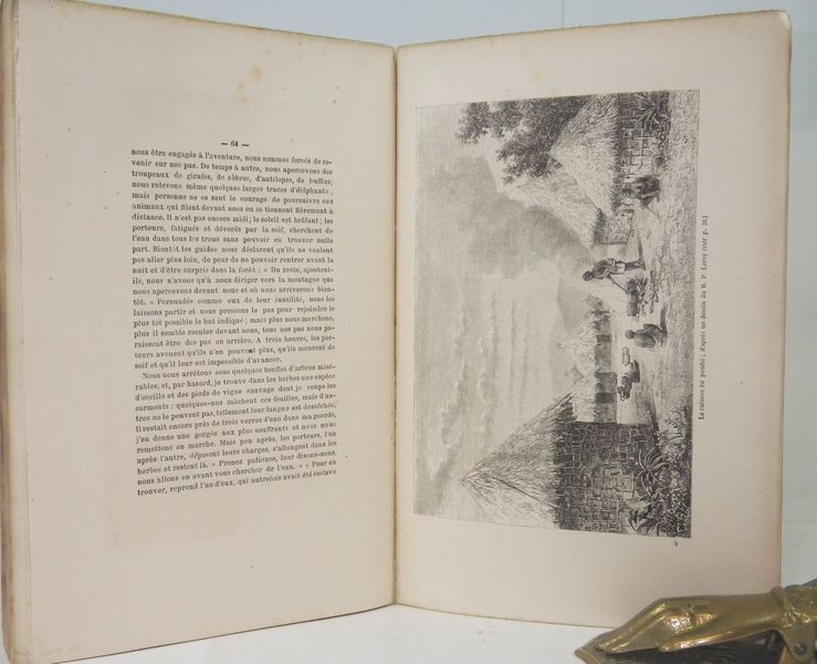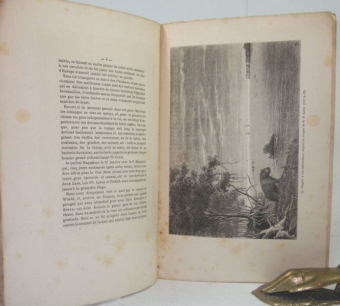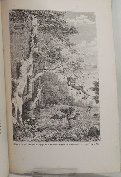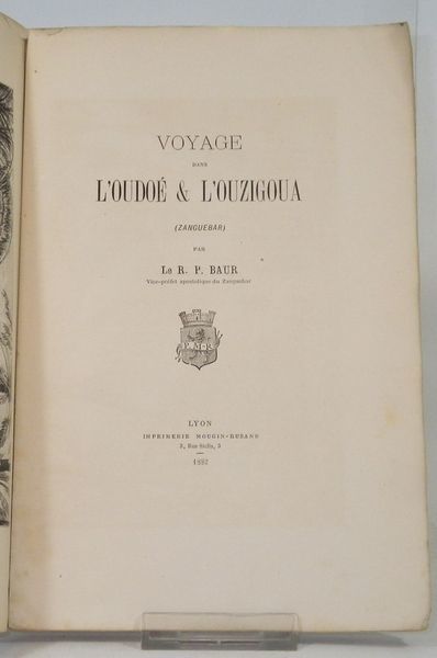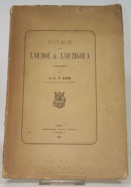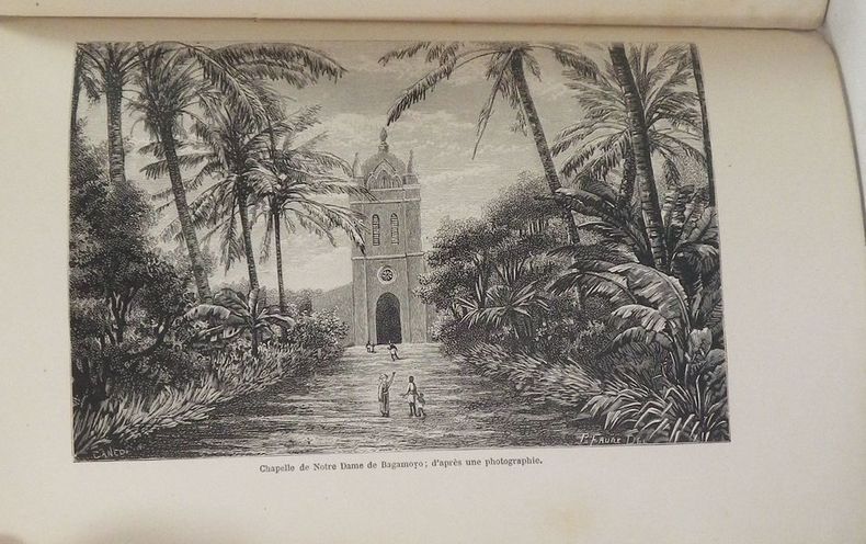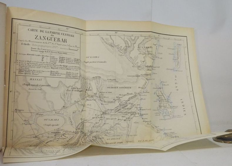 Lyon, imprimerie Mougin-Rusand, 1882. In-8 de 95 pages, 17 illustrations hors-texte en noir et une grande carte dépliante en couleurs de la partie centrale du Zanguebar. Quelques rousseurs. Broché, couverture beige imprimée en noir. Manque le dos et la dernière de couverture.