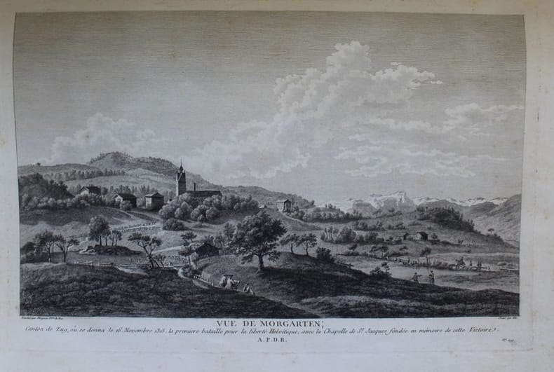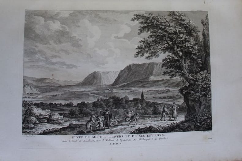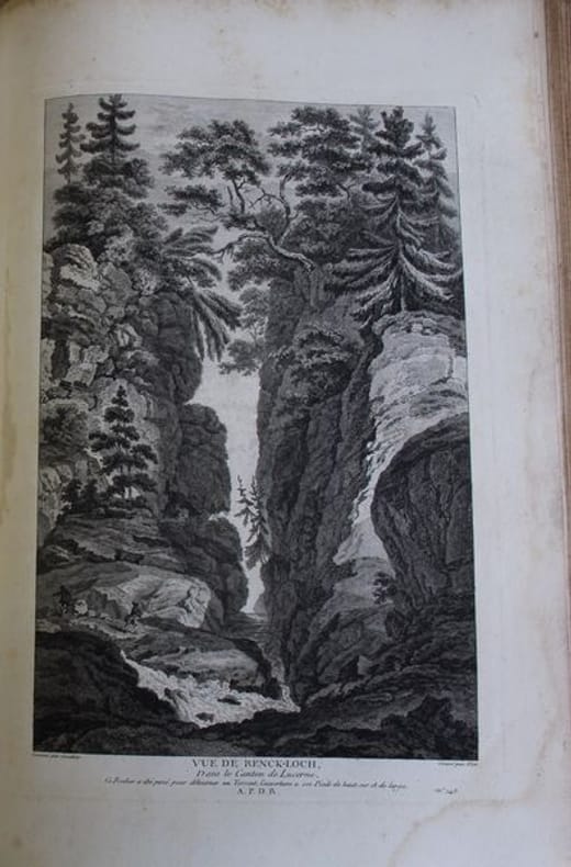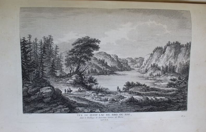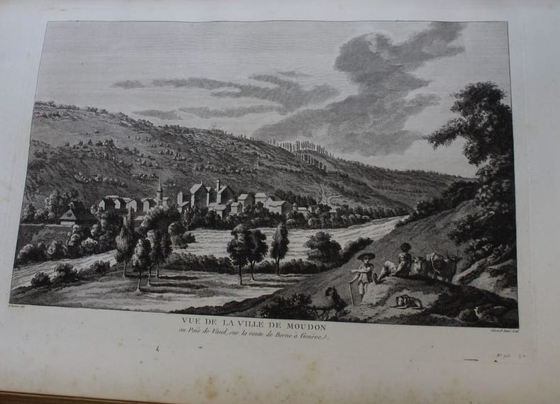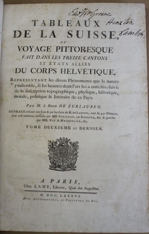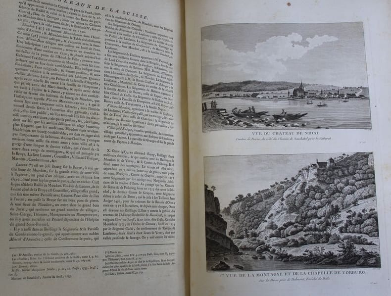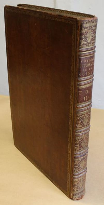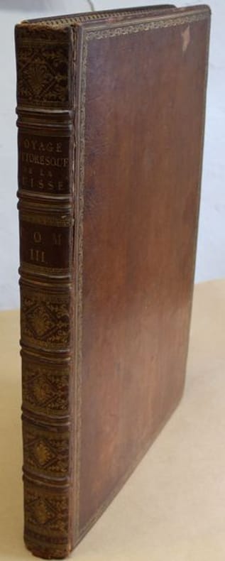 Tome III (sur 4) de cet ouvrage monumental, célèbre pour la qualité et l'abondance de ses planches. L'ouvrage complet doit comporter 2 tomes reliés parfois en 3, 4 ou 5 volumes avec les planches séparées, avec 430 Estampes sous 278 numéros représentant de magnifiques vues, cartes et portraits hors texte gravés par Née et Masquelier d'après Pérignon, Le Barbier, etc. Notre volume contient la première partie du Tome deuxième, celui-ci est tomé III au dos, il manque donc le Tome I (relié en 2 volumes, 366 - LXVI pp.) et la deuxième partie du Tome II (p. 363 à 578). Premier tirage de l'un des plus beaux livres illustrés sur la Suisse. L'ouvrage n'est pas moins intéressant par son texte : rédigé à la suite d'un véritable travail de collaboration entre spécialistes (Besson pour la minéralogie, Zurlauben pour l'histoire et le droit, Quétant, etc.), il offre pour l'époque la meilleure description des Cantons suisses, et aussi la plus renseignée en termes d'histoire et d'institutions. Sommaire : Etat des sciences et des arts - Moeurs des Suisses (Etats aristocratiques, démocratiques, helvétiques...) - Topographie , ( Canton de Zurich, Berne, Lucerne, Uri, Schweitz, Underwalden, Zoug, Glaris, Bâle, Fribourg ). Bel exemplaire en veau de l'époque. Provenance : De la bibliothèque E. H. Green Hinxton Cambridgeshire, avec ex-libris contrecollé et manuscrit. Brunet V, 1546.