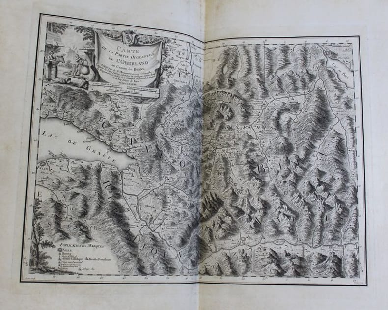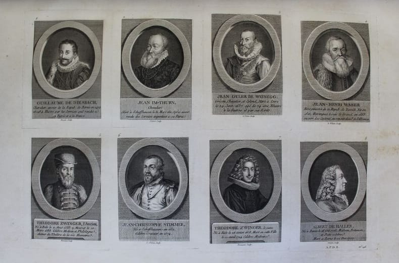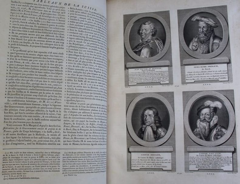 Paris, Chez Lamy, 1786. In-folio, (2)f. (titre et table), 362 pages, 10 planches hors-texte de portraits (soit 63 portraits), 7 grandes vues à pleine page, 28 vues à demi-page et une grande carte à double page de la partie occidentale d'Oberland canton de Berne. Manque la vue de la ville d'Avenche et le plan perspectif des cantons de Lucerne. De fines rousseurs et quelques claires mouillures marginales, un feuillet bruni. Bon état intérieur. Plein veau havane, dos à nerfs orné richement orné, pièce de titre et de tomaison, filet et roulette dorés d'encadrement sur les plats, roulette intérieure, tranches dorées. Mors fendus ( 2 sur environ 5 cms et 2 sur 15 cms), coiffe en pied accidentée, usures aux coins. Agréable reliure de l'époque, solide malgré les défauts signalés.
