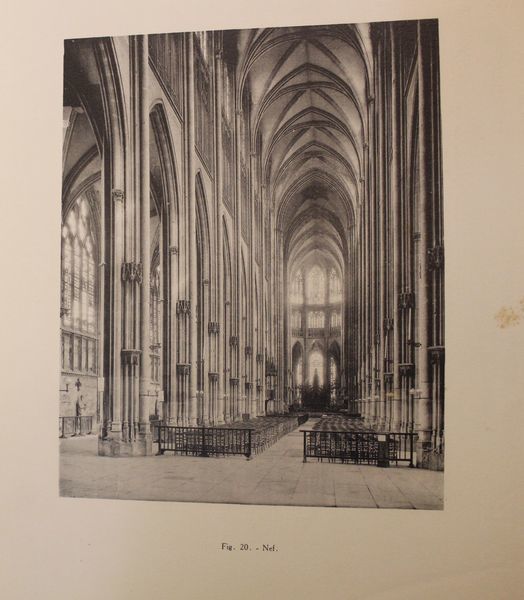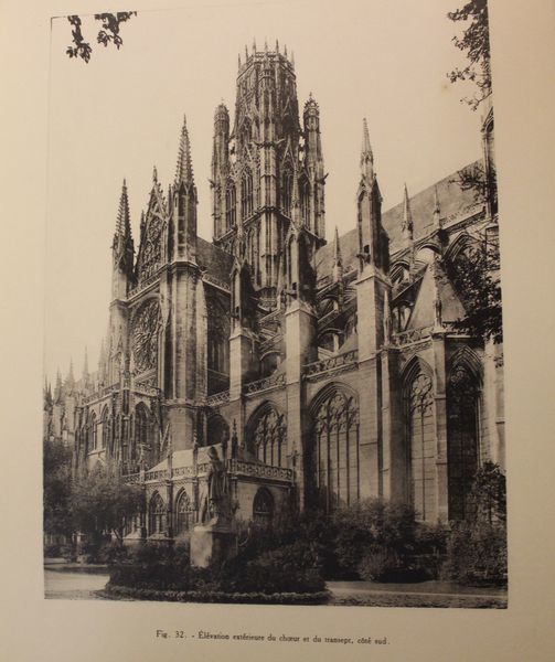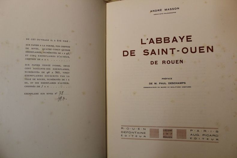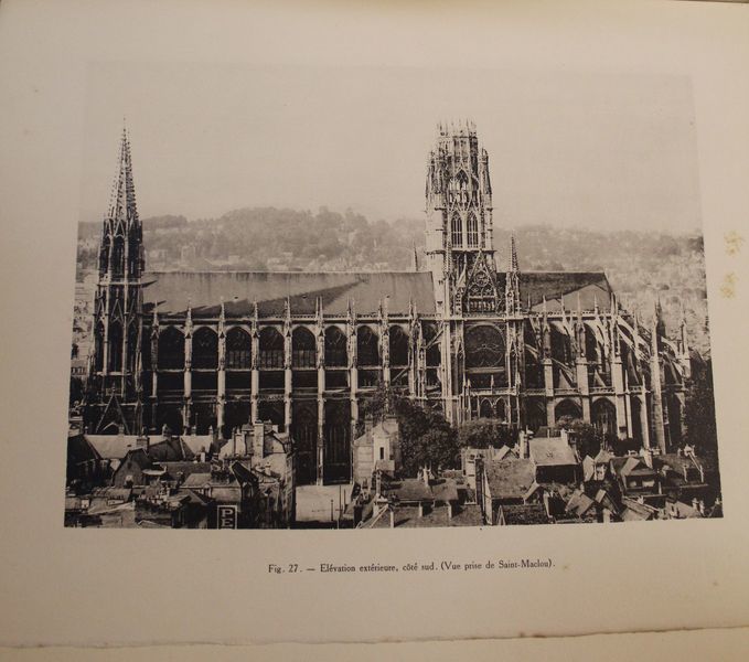 Rouen, Defontaine, Paris, Picard, 1930 texte et album en 1 vol. in-4, 86 pp. et 70 planches, demi-chagrin bleu nuit, dos à nerfs, guirlande dorée sur les nerfs, premiers plats de couverture conservés (reliure moderne). Mouillures en marge de 3 planches. Bon exemplaire.