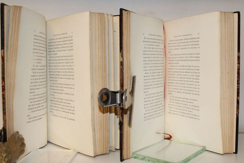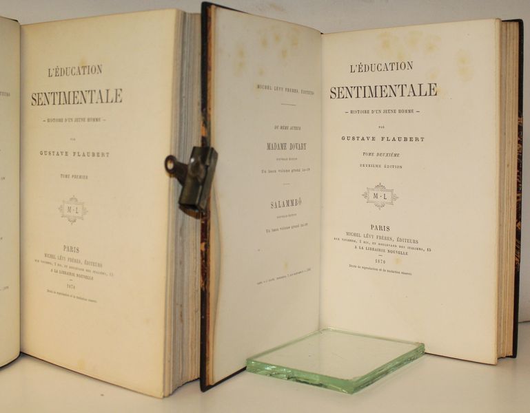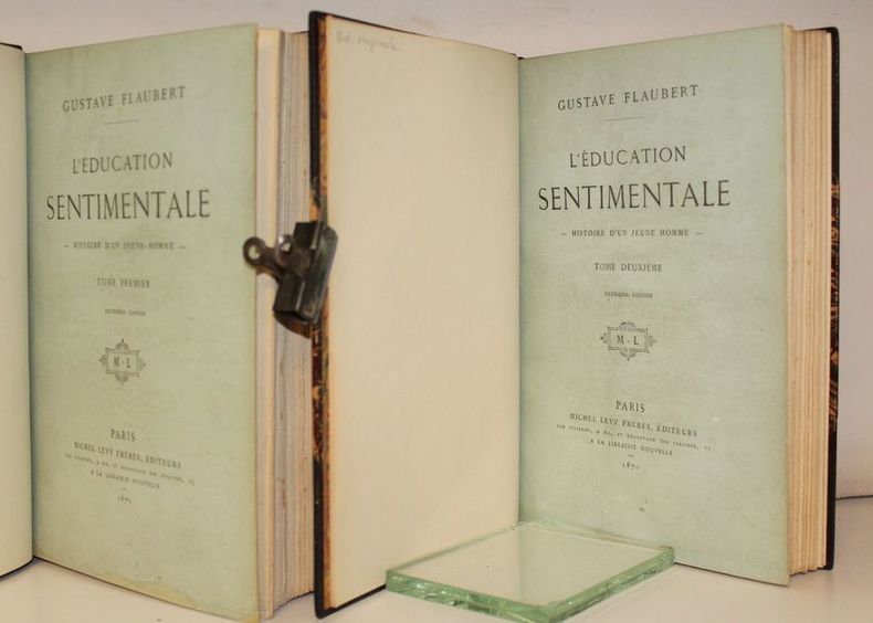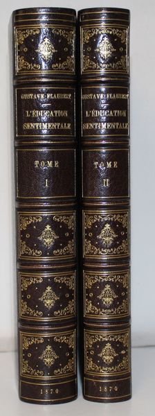 Edition originale. Vicaire, Manuel de l’amateur de livres du XIXe siècle, 726. Histoire d’un jeune homme, commencée à la fin de 1863 et écrite de septembre 1864 à mai 1869, « L’Education sentimentale » a paru en novembre 1869. Bien que riche de nombre détails autobiographiques, l’œuvre n’a rien de commun avec le roman de jeunesse écrit sous ce titre en 1845. La présence enchanteresse de Madame Arnoux qui domine l’œuvre entière comme Madame Schlesinger domina la pensée de Flaubert font assurément de ce roman un témoignage irrécusable sur la vie sentimentale de l’écrivain, avec les interférences et les recoupements du rêve et de la réalité dont cette œuvre est le fruit amer et brûlant. Tissée de réel et d’imaginaire « L’Education » est aussi l’histoire morale des hommes qui vécurent sous la monarchie de juillet, et l’évocation de toute la vie parisienne de la cinquième décade du XIXe siècle, cette fermentation politique et sociale qui conduisit à la révolution de 1848 et au coup d’état. « Comment aujourd’hui ne pas reconnaître en ce livre flaubertien par excellence et en cette œuvre goethéenne par son ampleur, un des livres capitaux de la littérature moderne qui a vu, par la suite, tant de copies de ce héros mélancolique. Certaines pages comme celles décrivant la rencontre des deux amants, à la fin du roman, comptent parmi les plus pures et les plus lyriques de toute l’œuvre flaubertienne ». Bel exemplaire à grandes marges, partiellement non rogné, conservé dans ses élégantes reliures de l’époque avec les couvertures bleues conservées.