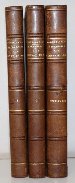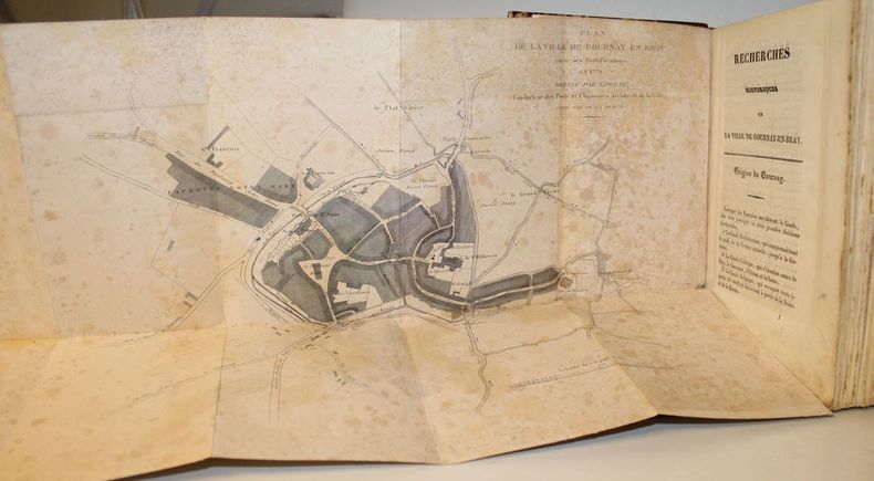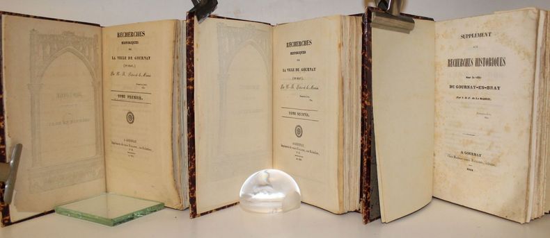 Gournay, Veuve Folloppe, 1842 & 1844. Trois volumes. Deux tomes in-8 pour les Recherches, 459 pages, 3 ff. d'errata et 430 pages, 2 ff. table et errata, 27 pages de souscripteurs, 4 planches (roussies) et 2 plans de la ville dépliants annoncés par Frère (déchirure à un plan). Un volume in-8 de 536 pages pour le Supplément, 11 planches dont de nombreux blasons et un petit plan du canton (2 pl. roussies). Demi-basane marron postérieure, dos à faux nerfs.