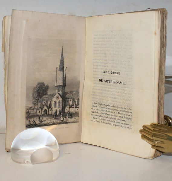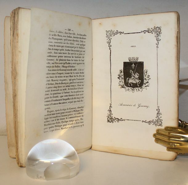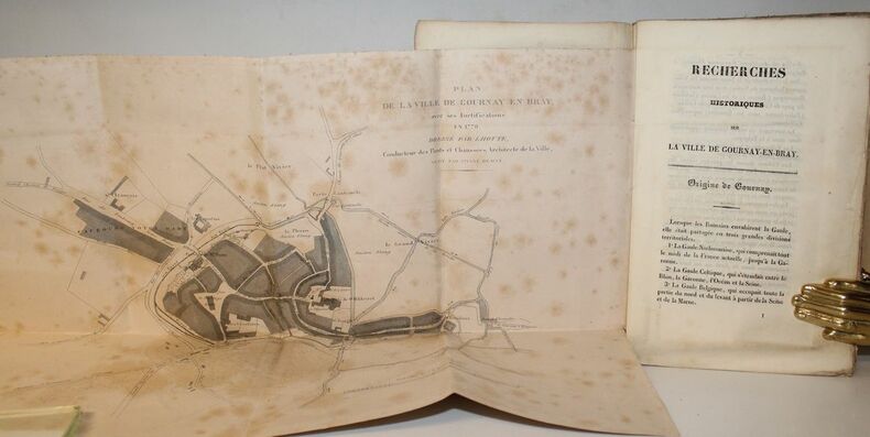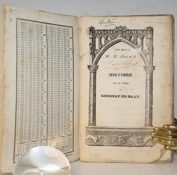 Gournay, Veuve Folloppe, 1842 & 1844. Trois volumes. Deux tomes in-8 pour les Recherches, 459 pages (ex-libris découpé au titre du tome Ier), 3 ff. d'errata et 430 pages, 2 ff. table et errata, 27 pages de souscripteurs, 4 planches (roussies) et 2 plans de la ville dépliants annoncés par Frère (roussis). Un volume in-8 de 536 pages pour le Supplément, 11 planches dont de nombreux blasons et un petit plan du canton ( roussies). Ex-libris d'Edouard Pelay, célèbre bibliophile rouennais et de G. Vuatrin à Ménerval. Broché, manques de papier aux dos, brochage décousu, manque la dernière couverture du Supplément, quelques rousseurs..