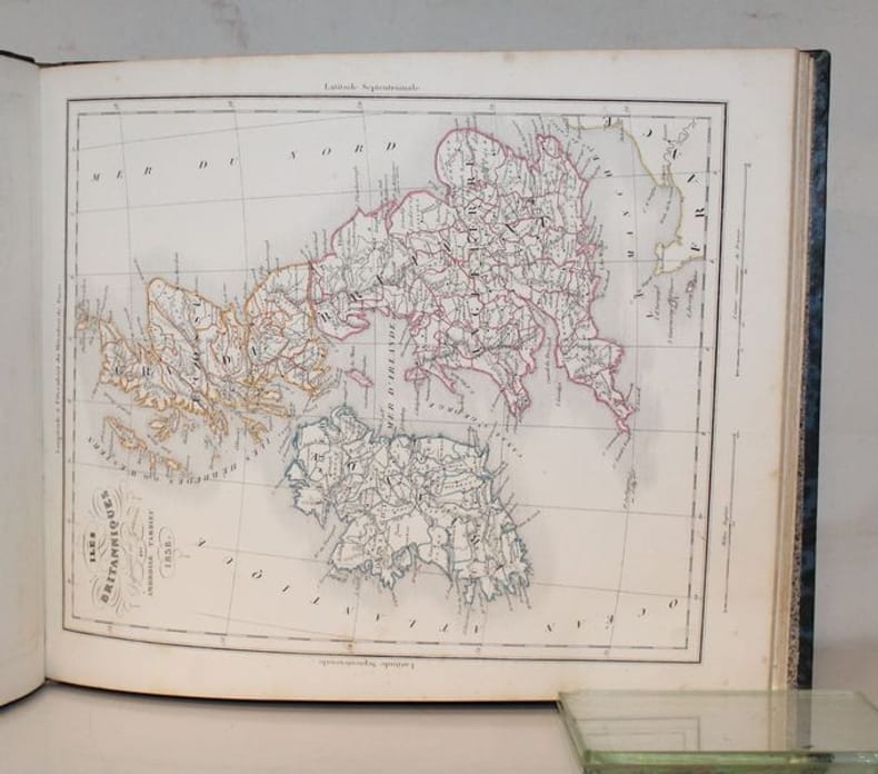 Paris Just TESSIER 1838 -in-8 demi chagrin 4 volumes, reliure demi-chagrin rouge in-octavo (binding half shagreen in-octavo) (21,7 x 13,6 cm), TRES BELLE RELIURE ROMANTIQUE d'Epoque, dos long (spine without raised bands), décoré "or" et à froid (gilt and blind stamping decoration), titre et tomaison frappés "or" avec de part et d'autre un décor romantique "rocailles" or et à froid (plaque spéciale Editeur)dans un encadrement du tout d'un filet "or", papier gauffré décoré à froid orange aux plats, orné de nombreuses gravures hors-textye en noir avec serpentes, rousseurs habituelles pour les livres de cette époque, 456 + 456 + 447 + 436 pages, 1838 Paris Just TESSIER Editeur + UN ATLAS : reliure demi-basane vert foncé in octavo oblong (22,8 x 28,6 cm), dos à nerfs (spine with raised bands), décoration "or" et à froid (gilt and blind stamping decoration), auteur titre de la collection et titre frappés "or", pièce de titre et auteurs sur fond noir avec un filet "or" de part et d'autre, roulette "or" en place des nerfs avec un filet à froid de part et d'autre des nerfs, filets "or" et filets perlés "or" en tête et en pied, papier peigné vert et rouge aux plats, Atlas de 13 planches Hors-texte en noir, de la sixième Edition de 1843 à Paris chez just Tessier Editeur,
