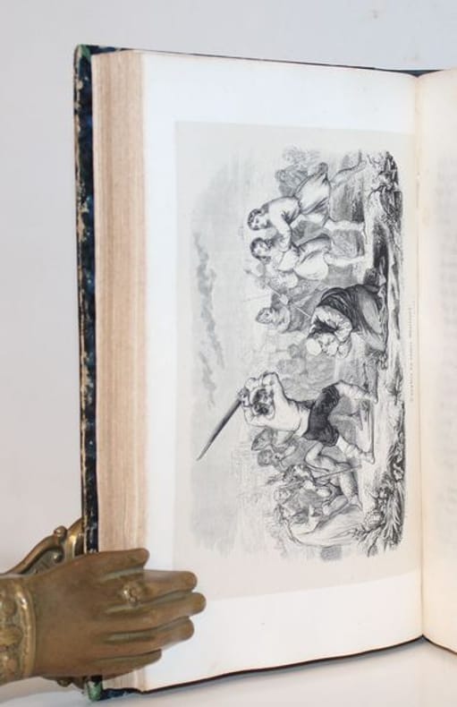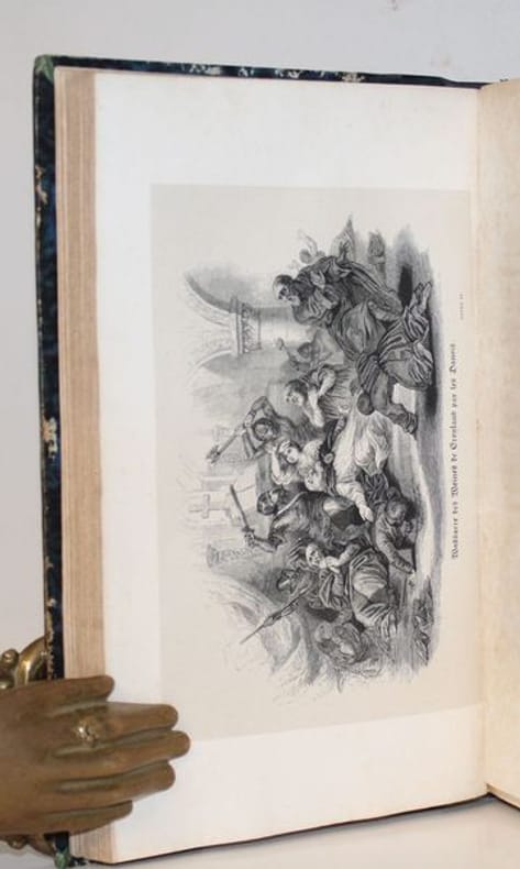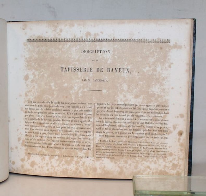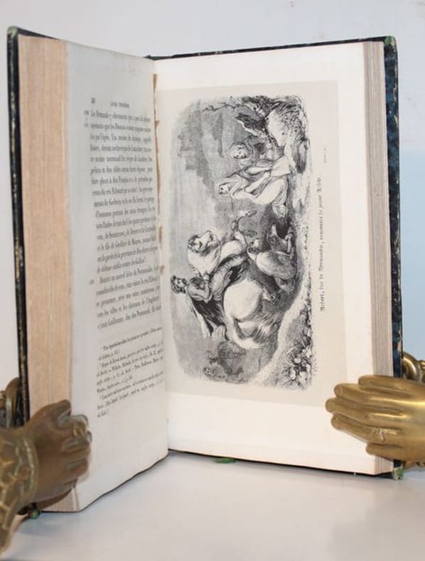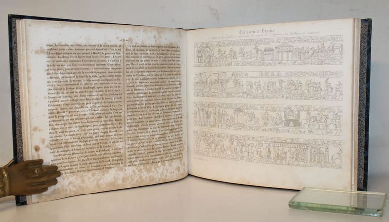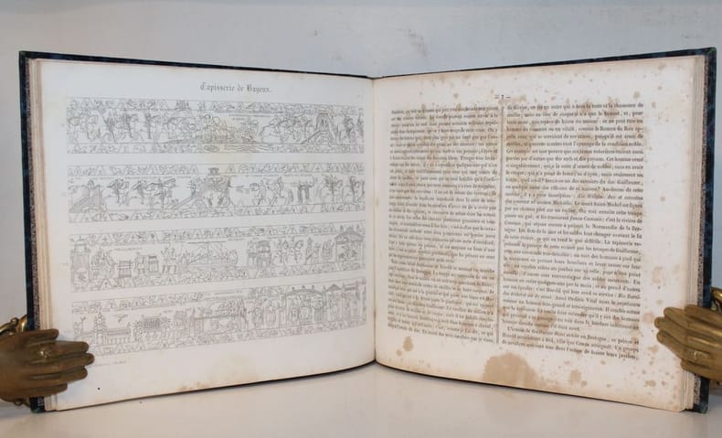 Paris, Tessier, 1838. Quatre volumes in-8 avec de nombreuses planches tirées sur chine et un atlas oblong de 14 planches dont 5 de la tapisserie de Bayeux, 4 cartes (rousseurs). Quelques rousseurs. Demi-veau bleu-nuit d'époque, filets dorés au dos, très bon état général, malgré de petits frottements et une amorce de mors fendu.